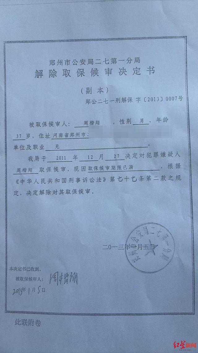 2024年,事情有了变化。周楷翔说,在多次反映、申诉的情况下,郑州公安二七分局的民警让他补签一份解除取保候审决定书。记者看到了周楷翔提供的《解除取保候审决定书》(郑公二七一刑解保字〔2013〕0007号),上面写明“取保候审期限已满”,决定解除取保候审,落款日期为“二〇一三年一月五日”。