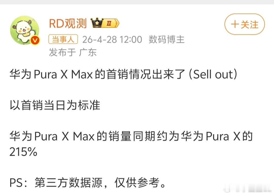 华为PuraXMax首销日销量曝光首销当日为标准,Pura X Max的销量同期约为Pura X的215%。
