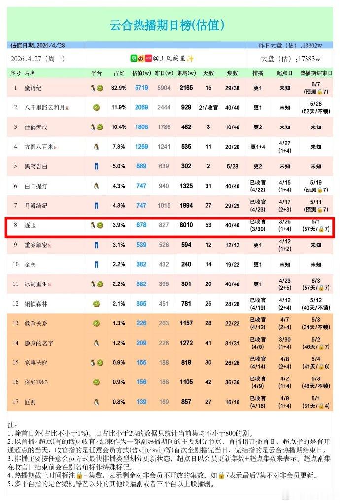 逐玉云合总榜第九逐玉云合集均第九:2020年云合改版以来总榜第九