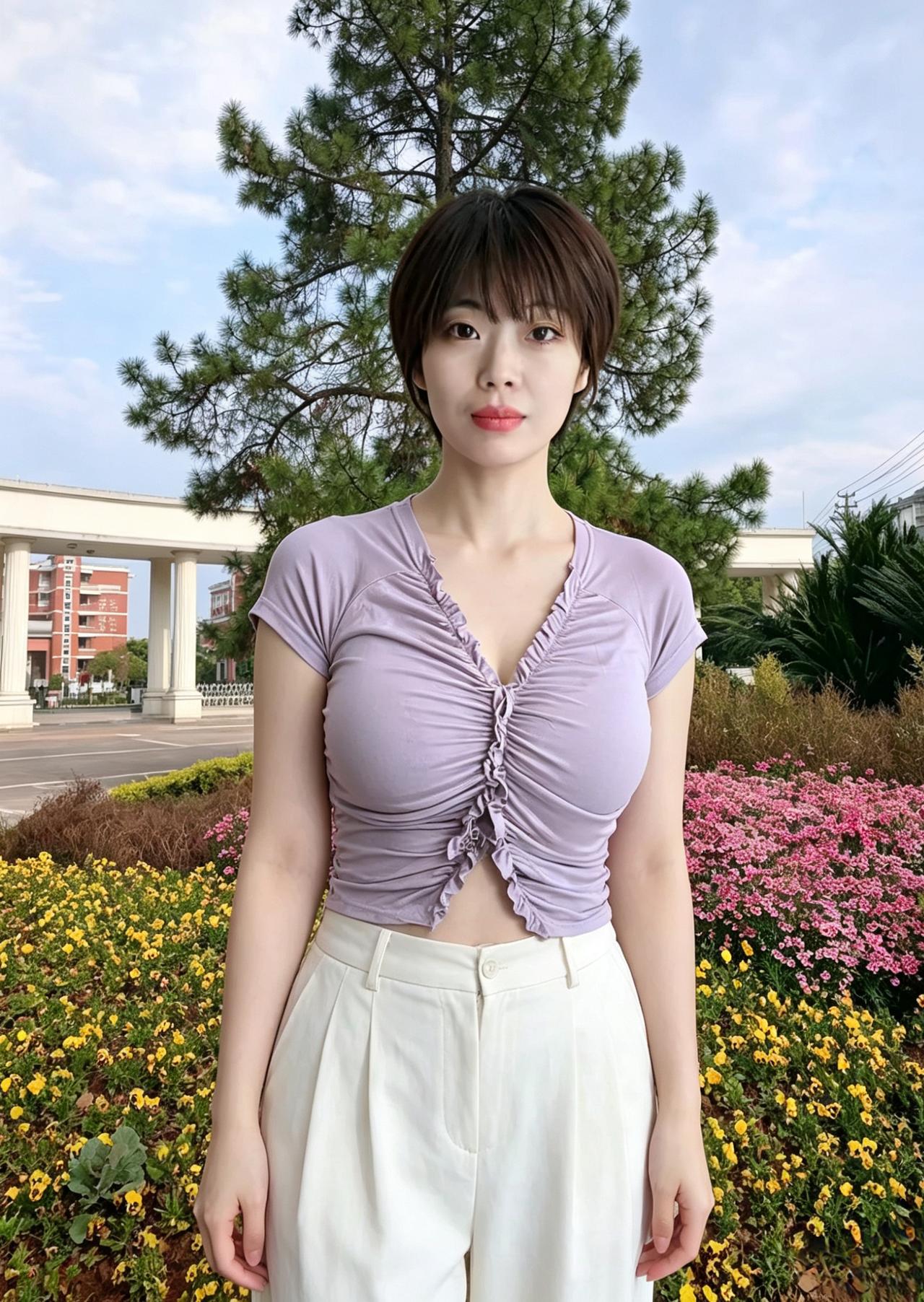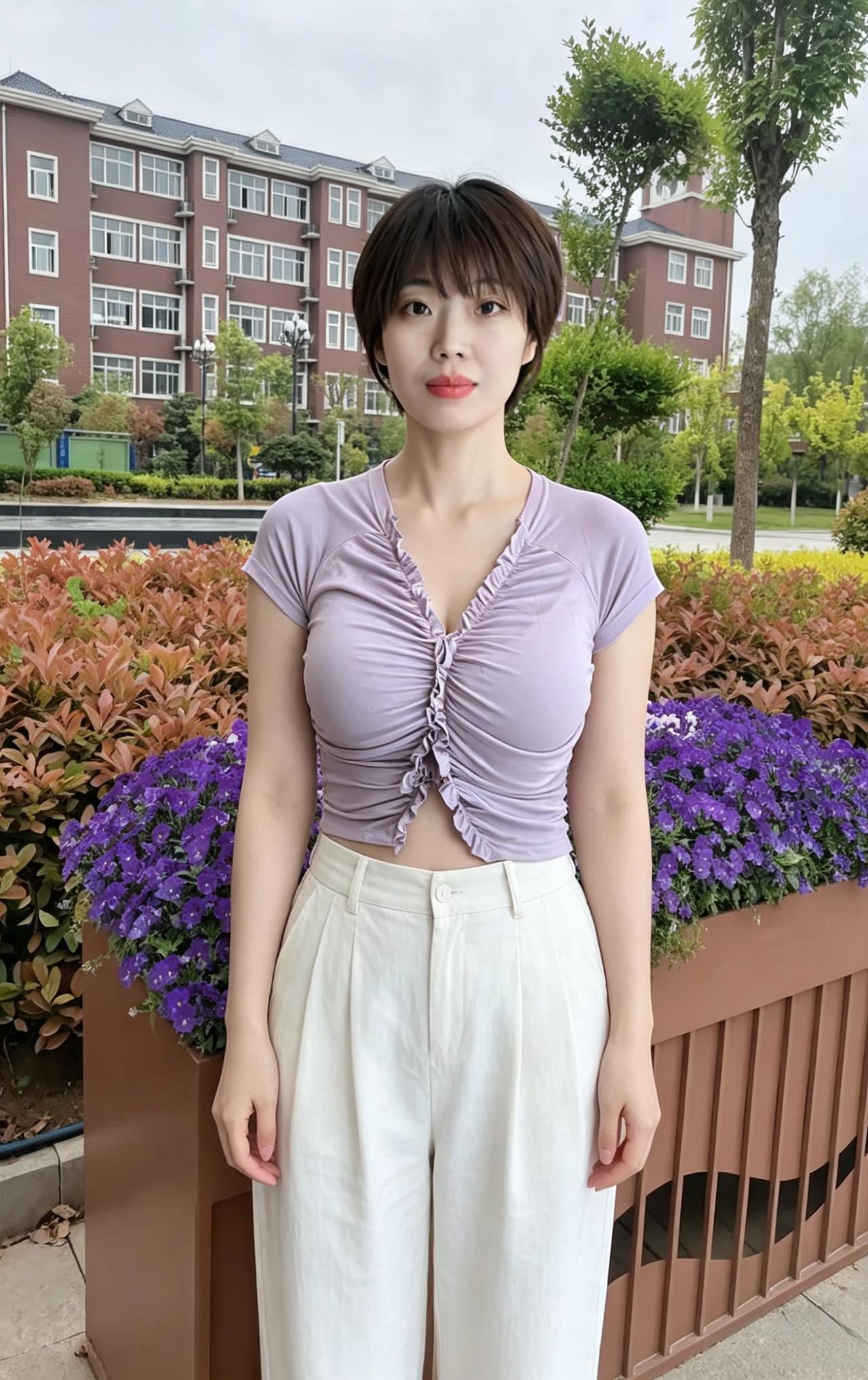 紫衫短打映晴川,短发清灵胜玉烟。 笑靥轻开花失色,一颦一笑落人间。