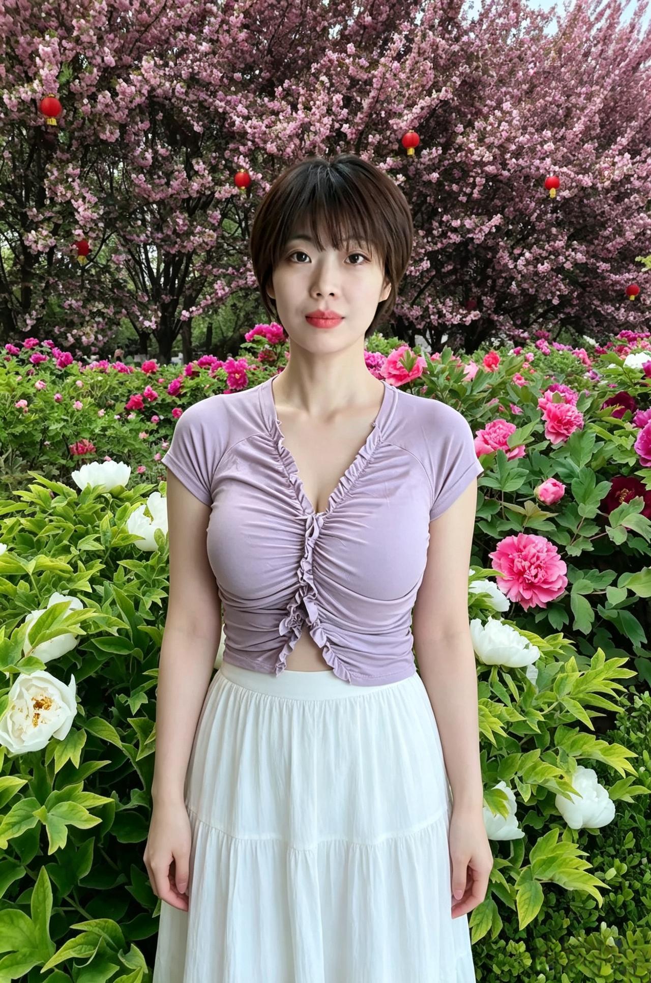 雅致衣装气质佳,温婉眉眼韵如纱。 春心一点藏衣畔,落落风华胜百花。