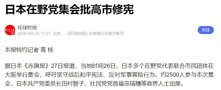 日本首相高市早苗近日在自民党大会上公然宣称修宪"时机已到",明确提出要在明年党大会前取得修宪动议的实质进展。 这一表态标志着日本右翼势力正从"暗度陈仓"转向明目张胆的"正面强攻",妄图彻底突破战后和平宪法的约束,再次将日本推向"赌国运"的危险边缘。 日本现行的和平宪法自1947年施行以来,已经守护了日本近80年的和平发展。 其中第九条明确规定日本永远放弃战争权、不保有军队、不承认国家交战权,这是战后国际秩序的重要基石,也是日本作为和平国家的根本标志。 然而,自1955年自民党成立之日起,修改宪法就被写入党纲,成为日本右翼势力几十年来从未放弃的核心政治诉求。 高市早苗之所以如此急于推动修宪,主要是因为她认为当前的政治条件已经"成熟"。 在今年2月的众议院选举中,自民党单独获得了超过三分之二的议席,达到了在众议院发起修宪动议的法定门槛。同时,新的执政伙伴日本维新会在修宪议题上态度积极,不再像之前的公明党那样起到牵制作用。这让高市早苗觉得这是摆脱宪法约束的"历史窗口期"。 按照自民党公布的计划,他们将在国会参众两院设立宪法条文起草委员会,重点推进两项核心内容:一是将自卫队正式写入宪法,从法理上确立其正规军事力量的地位;二是扩大政府在紧急状态下的权限,进一步强化行政权力。 自民党干事长铃木俊一也公开表示,与过去相比修宪时机逐渐成熟,将切实向前推进。 然而,高市早苗政府的修宪企图在日本国内遭到了强烈反对。本月以来,日本已经爆发了两次大规模的反修宪集会,每次都有超过3万名民众聚集在国会议事堂前,手举"反对战争""守护宪法第九条""高市下台"等标语进行抗议。 全日本共有160余个地点举行了同主题的抗议活动,参与人数总计接近5万人。 许多日本民众指出,物价上涨、日元贬值等民生问题才是政府应该优先解决的当务之急,而不是推动修宪扩军。 国际社会也对日本的这一危险动向保持高度警惕。中国外交部多次表示,国际社会必须高度警惕日本"新型军国主义"的妄动,敦促日方深刻反省军国主义侵略历史,在军事安全领域恪守承诺、慎重行事。 日本的修宪和扩军行为,不仅会动摇战后国际秩序的基础,也会给东北亚地区的和平稳定带来严重威胁。 历史已经无数次证明,军国主义道路只会给日本和世界带来灾难。高市早苗政府不顾国内民众的反对和国际社会的担忧,一意孤行强推修宪,本质上是在复活军国主义的野心。 这种倒行逆施的行为,最终只会让日本再次走上"赌国运"的绝路,其后果不堪设想。