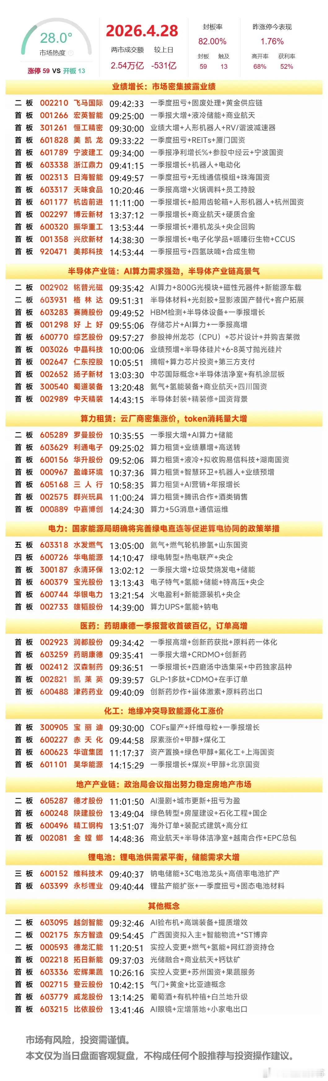 4月28日A股涨停复盘:医药、算力租赁受益龙头业绩多股大涨,化工局部反弹,电子特气分歧走强,绿电午盘再度拉升