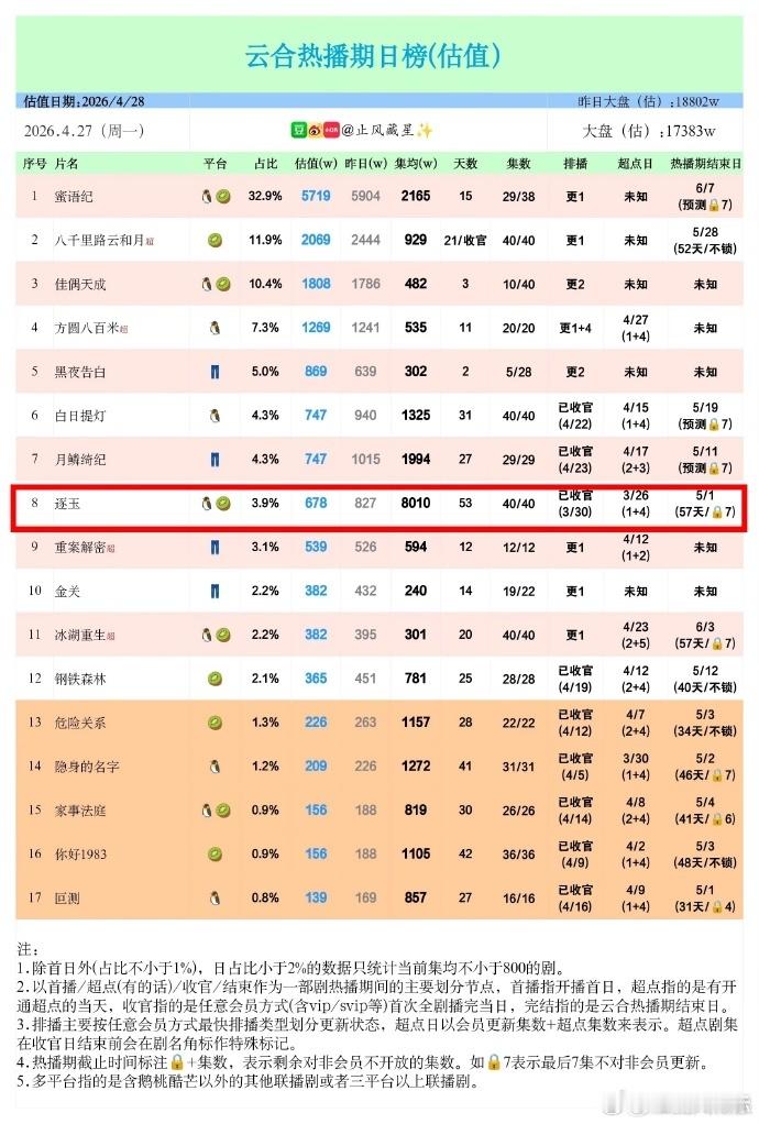 2020年云合改版以来总榜第九!女频史冠!逐玉创造历史,成为第一部进入8000俱
