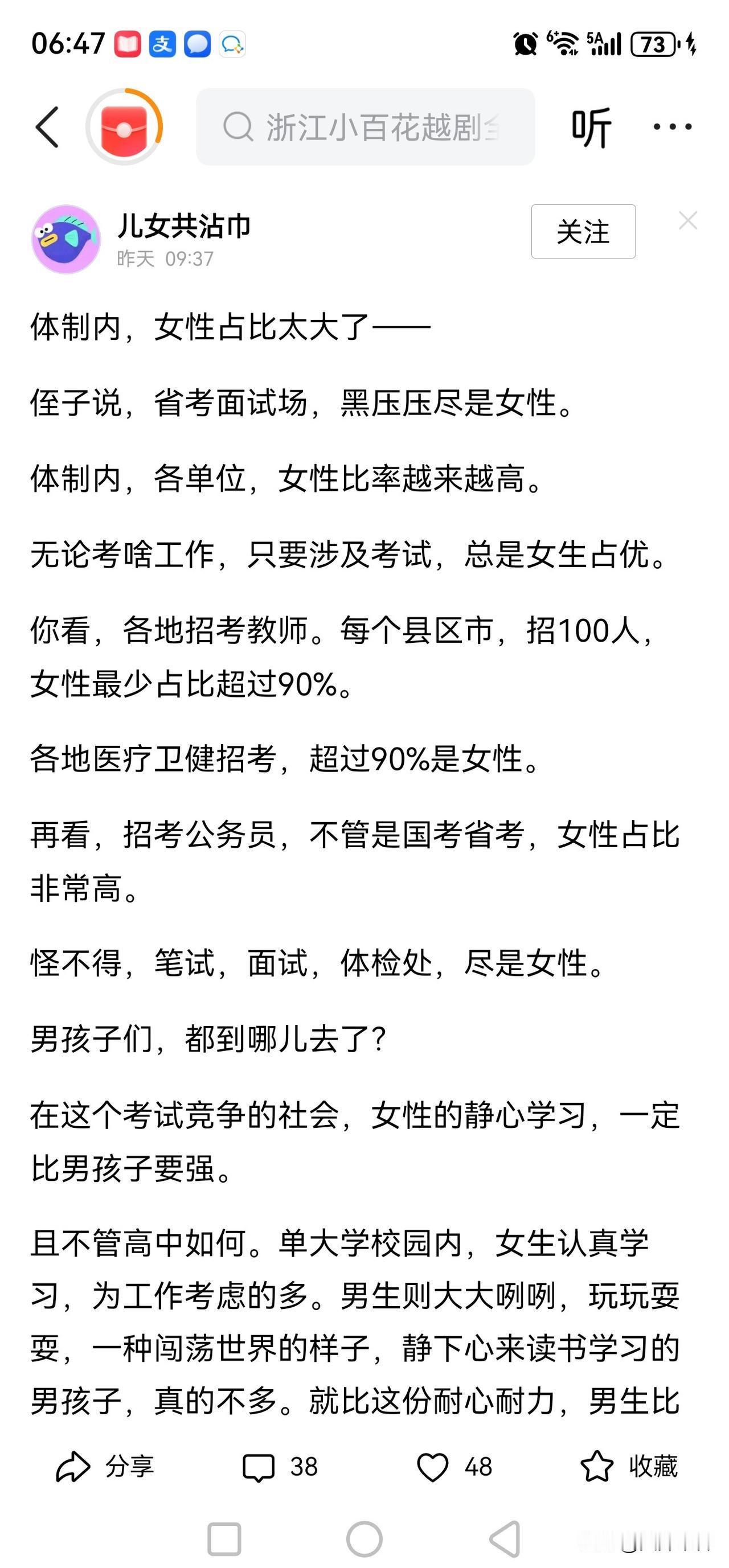 这还了得,体制内女性占比太高,这些女人更看不起男生了。看看现在的公务员团队,女性比例越来越高,这些人一旦入职,优越感膨胀,普通男根本入不了她们法眼,不婚不育将继续扩大,如何是好?建议改变考试规则,公务员考试不能光考文的,应该把数理化纳入考试中,并提高比例,以平衡男女在公务员队伍中的比例。