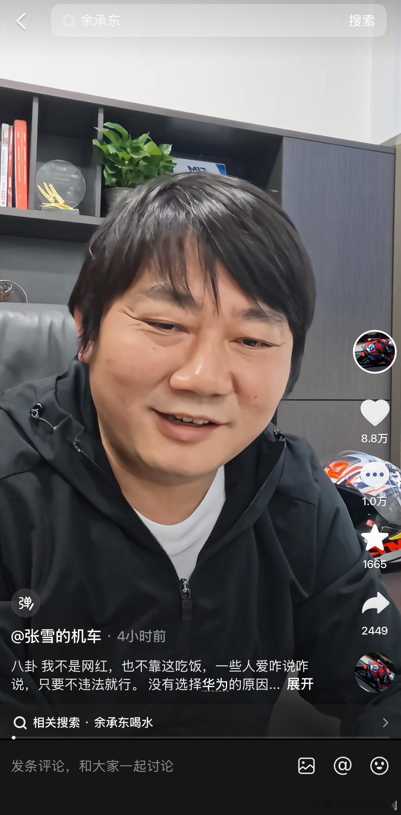 下午刚好刷到张雪的视频,能看的出来他是一个非常真性情的人,不吐不快,想到哪说哪,说实话这是如今互联网时代非常难能可贵的活人感了,因为太多公司老总都是被市场部、公关部安排的“木偶人”,至于张雪支持老余这事,但凡有点独立思考的人应该都不会拿老余发布会候场这种事硬黑,更别说人家本身就是腰骨折之后强撑着上台,张雪打抱不平太正常了!