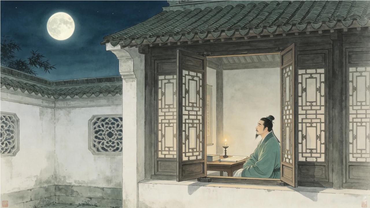 上联:孤窗静对三更月 下联:瘦影闲斟半夜风
