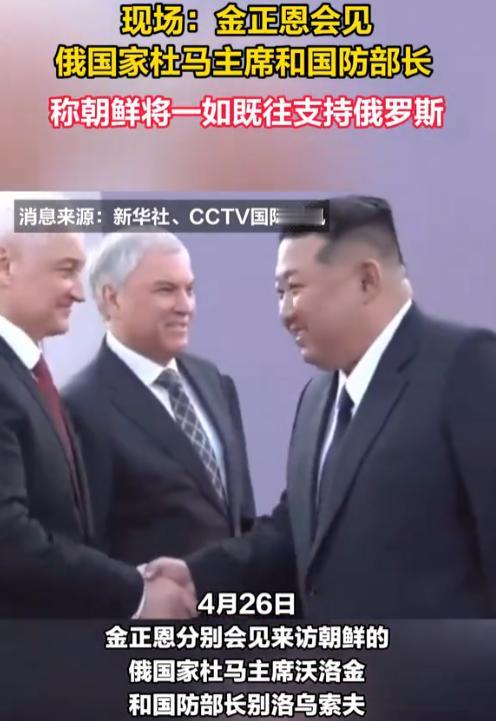 东亚局势彻底变天! 平壤迎来史诗级外交会晤,俄两大核心高官密集访朝,释放极强战略信号。俄朝公开敲定长期军事合作规划,朝方直言两军并肩作战取得战果、力挺俄罗斯到底。 就在4月26日,朝鲜一号人物金正恩在金碧辉煌的平壤,一口气高规格接见了两位远道而来的重量级俄罗斯大佬——俄国家杜马主席沃洛金和国防部长别洛乌索夫。 这要是放在以前,俄罗斯的防长跑到平壤去串门,那简直就是天方夜谭。 但现在不同了,俄朝早就签了《全面战略伙伴关系条约》,现在已经进入“蜜月期”。尤其是这次会见中传递出来的几个信号,那真是暗藏杀机,信息量极大。 首先,金正恩他直接表示,朝俄两国军队和人民在库尔斯克的并肩战斗取得胜利,是证明两国同盟关系强大和巩固的“历史事件”。这不仅仅是对俄军战斗力的夸赞,更是在公开宣誓:朝鲜军人,确实亲自下场在俄罗斯本土库尔斯克地区动真格了,而且打得很漂亮! 金正恩在会见中直言,朝鲜将一如既往,全面支持俄罗斯维护国家主权和领土完整的政策。这“一如既往”四个字,就是给普京吃了一颗定心丸。 在欧盟刚批了巨额对乌援助,俄罗斯本土经济又因战争出现下滑的当下,这种来自东方的支持显得尤为金贵,等于是告诉西方:这盘棋,朝鲜陪俄罗斯下到底。 就在这次会见中,别洛乌索夫直接亮出了底牌。根据俄罗斯塔斯社的消息,别洛乌索夫在会上已经明确表态:俄方与朝方商定将军事合作提升到可持续的长期水平,并且今年就准备签署2027到2031年的五年军事合作计划。 这次的“五年计划”意味着俄罗斯是要在制度上跟朝鲜彻底绑定,从单纯的军火采购,全面升级为联合演习、技术共享、军工产业一体化的准军事同盟。 这下子,一直在旁边仔细观察的美韩两国,恐怕后背都要冒冷汗了。俄方这次摆明了就是要把朝鲜打造成坚固的“东方前哨”,让朝鲜做牵制美韩的“王牌”。 而朝鲜这边也是眼光独到,利用这一波价值连城的军事合作,不仅可以大规模提升朝军的导弹技术、卫星侦察能力,甚至向核潜艇方向迈进,手里握住了更大的筹码。 总的来说,这不仅仅是一次简单的外交会见,更像是一场精心策划的战略宣示。 普京通过朝鲜这张牌,把东北亚的水彻底搅浑,成功拉扯了美国在亚太的军事资源,减轻了西线承受的压力。 对于朝鲜而言,金正恩则不仅拿到了武器换代的秘籍,更在事实上通过“血盟”的身份,打破了长期以来的外交孤立。 正如韩媒所担心的那样,现在的俄朝关系已经不再是机会主义的交易伙伴,而是正在向长期血盟转变。 这个世界本就是一个巨大的棋盘,随着东方这枚“炮”落下,所有的棋手恐怕都得重新审视自己的走位了。