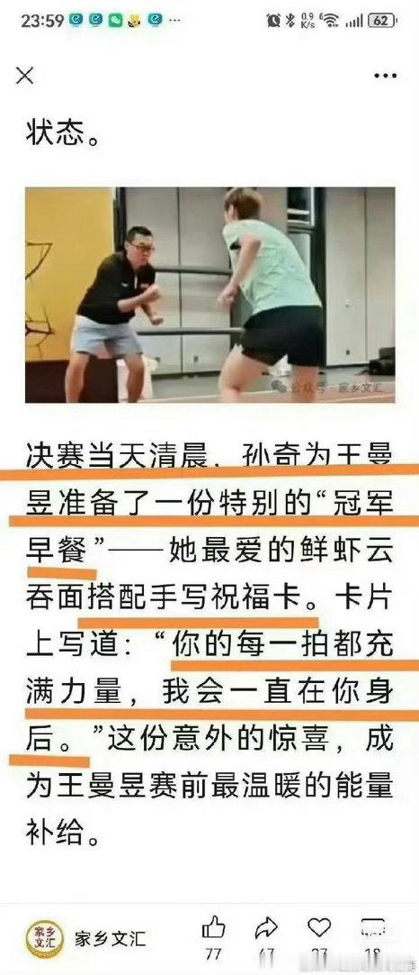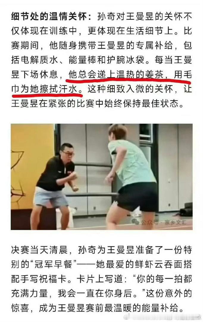 决赛当天清晨,孙奇为王曼昱准备了一份特别的“冠军早餐—她最爱的鲜虾云吞面搭配手写祝福卡。卡片上写道:“你的每一拍都充满力量,我会一直在你身后。”这么贴心温暖怪不得这么多王曼昱粉丝遗憾😔