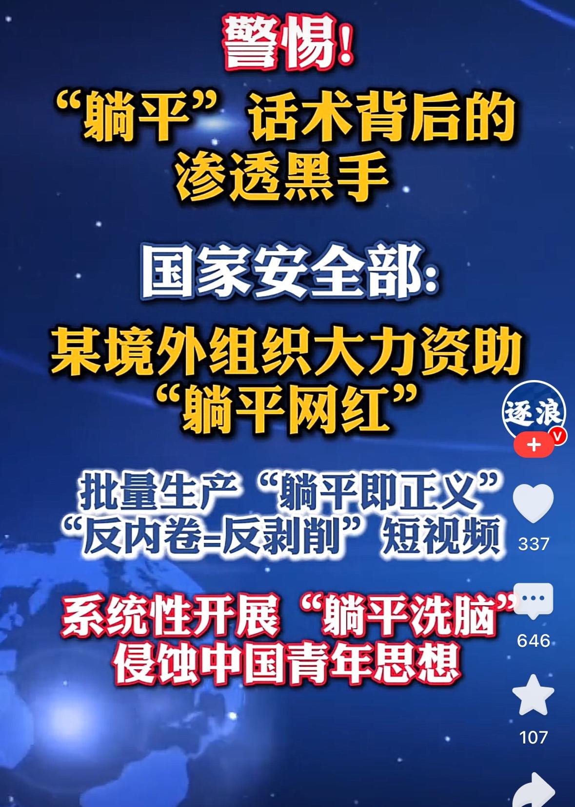 鼓吹青年人躺平,不仅仅有境外有组织洗脑,同时还要警惕我们一些专家的误导,错误价值观的误导。一些教育专家也被洗脑,极端鼓吹强调个人感受,兴趣爱好,忘记对父母对社会国家的责任。这种人很容易只有个人感受和兴趣爱好,忘记责任,忘记奋斗,把奋斗妖魔化为内卷!