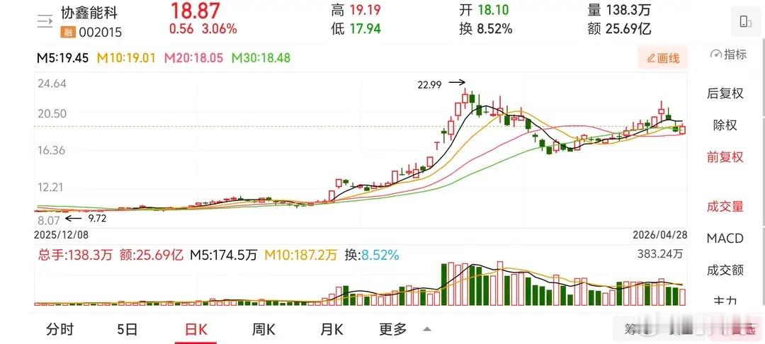 4月28日,协鑫能科盘中走势震荡,早盘低开于18.1元,短暂消化前一日6.15%的大跌跌幅后震荡走高,最高触及19.19元,最终收于18.87元,涨幅3.06%,单日振幅6.83%,成交额超25亿。前一日该股主力资金净流出3.47亿,换手率9.37%,成交额28亿,多空资金在18元价位激烈博弈,分歧显著。