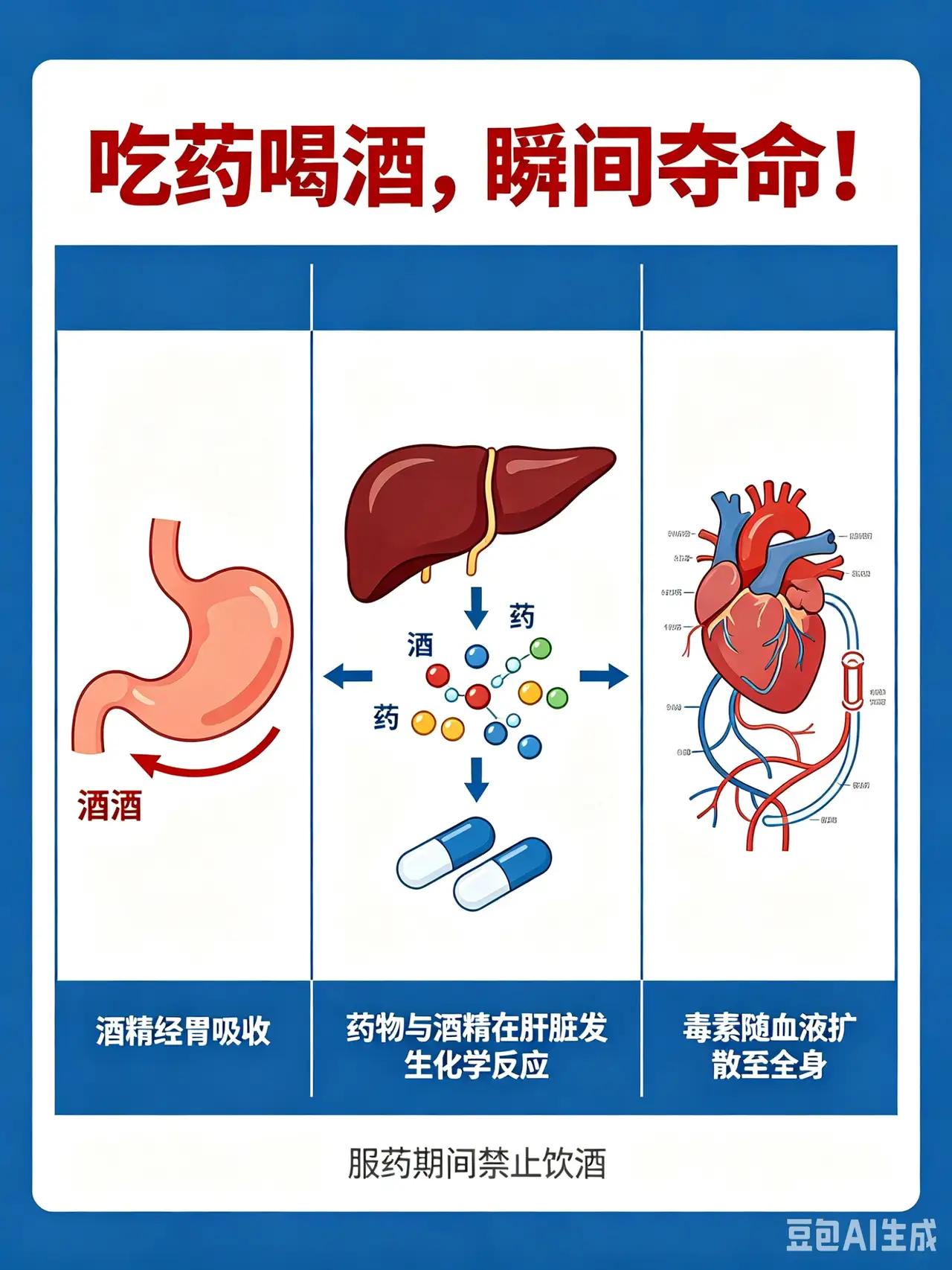 必看!这几类药碰酒就出事,头孢只是其中一种 服药后饮酒,轻则引发身体不适,重则危及生命,这些药物绝对不能与酒同服,一定要牢记! 最需要高度警惕的是头孢类抗生素,服药期间及停药后7天内严禁饮酒,否则会引发双硫仑样反应,出现头晕、呕吐、心悸等症状,严重时可导致呼吸衰竭、休克甚至死亡。 除了头孢,这几类药物也绝不能碰酒,风险同样极高: - 解热镇痛药:布洛芬、对乙酰氨基酚等,与酒同服易刺激胃黏膜,引发胃出血、胃穿孔,还会加重肝脏代谢负担,造成肝损伤。 - 镇静催眠药:安定、艾司唑仑等,酒精会增强药物的中枢抑制作用,叠加后会加重嗜睡、头晕,甚至导致呼吸抑制、昏迷。 - 降压/降糖药:饮酒会扩张血管、抑制糖原异生,与降压药同服易致血压骤降,与降糖药同服易引发低血糖休克,均可能出现头晕、晕厥等危险。 - 抗抑郁/抗组胺药:酒精会放大药物的镇静效果,加重嗜睡、乏力、判断力下降,不仅影响日常行动,还可能引发意外事故。 服药期间请严格禁酒,停药后也需根据药物类型,遵医嘱等待足够时长再饮酒,切勿心存侥幸! 用药安全误区 用药安全冷知识