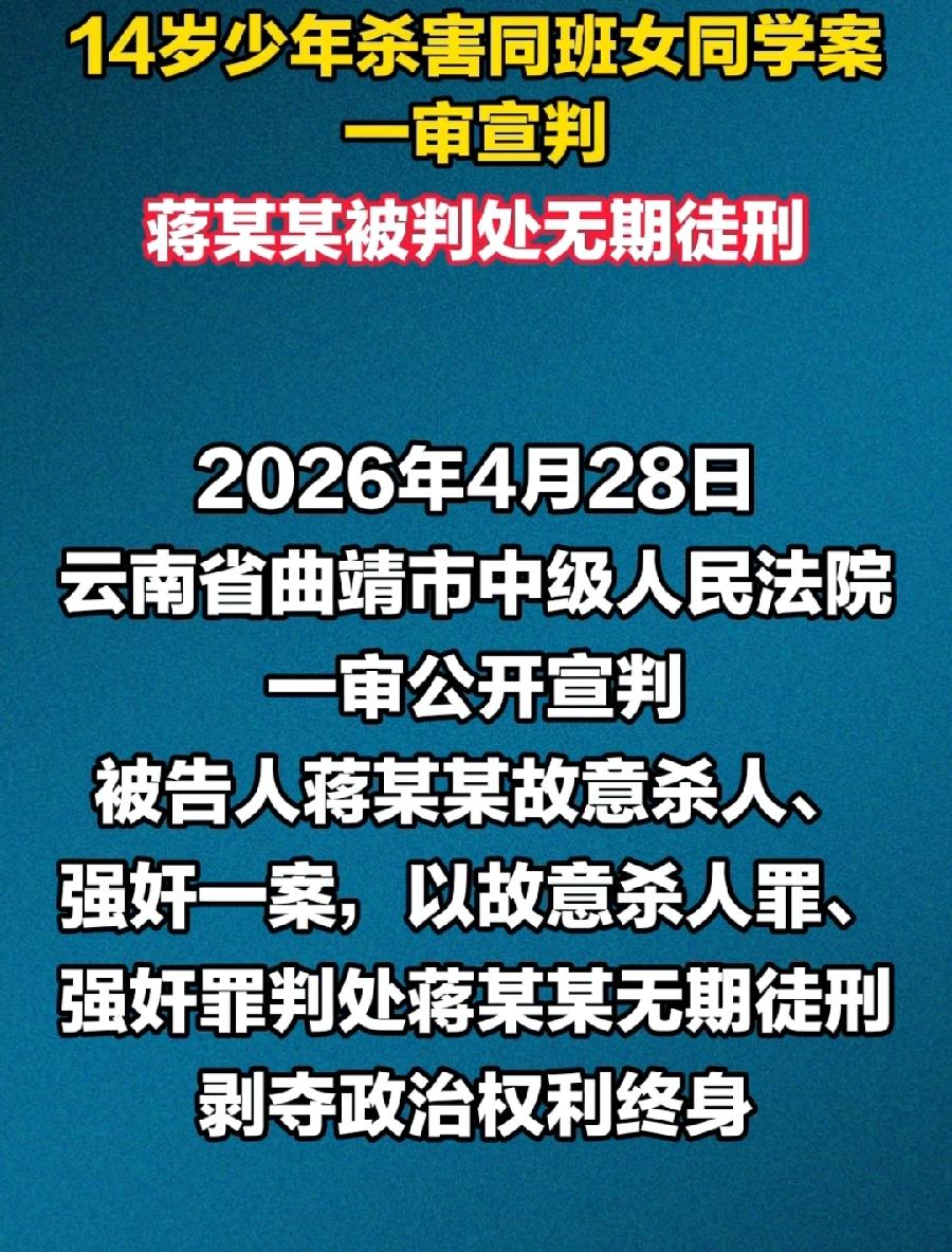 曲靖蒋某英无期,慢慢减,20年就出来了,到时才34岁,不耽误结婚生子,人生还可以重来!可是女同学才15岁,花季突然凋零,人生还没开始! 悲剧原因在哪里?蒋某英父母,对孩子性教育缺失,中国家庭特别农村对性讳莫如深,青春期正是性萌动的年纪,如果受不良思想诱惑,很容易一时冲动不知觉地走上犯罪道路!事发时深夜11点,突然一时性起就是证明! 被害方某某家庭也有一定原因,父母长期在外务工,女孩一个人在家,二人同村同班,蒋某英肯定知道,认为对方没有人保护,有机可趁! 现在孩子早熟,该案有极强的现象普遍性以及警示教育意义!警示每一位父母!