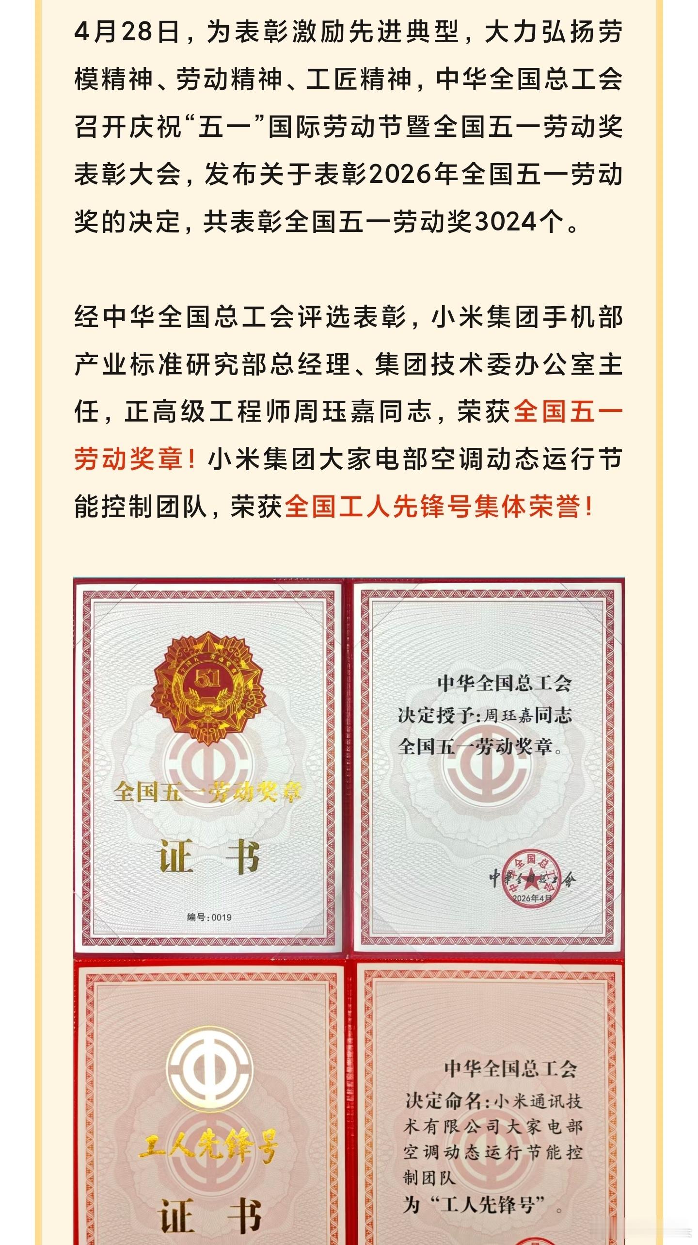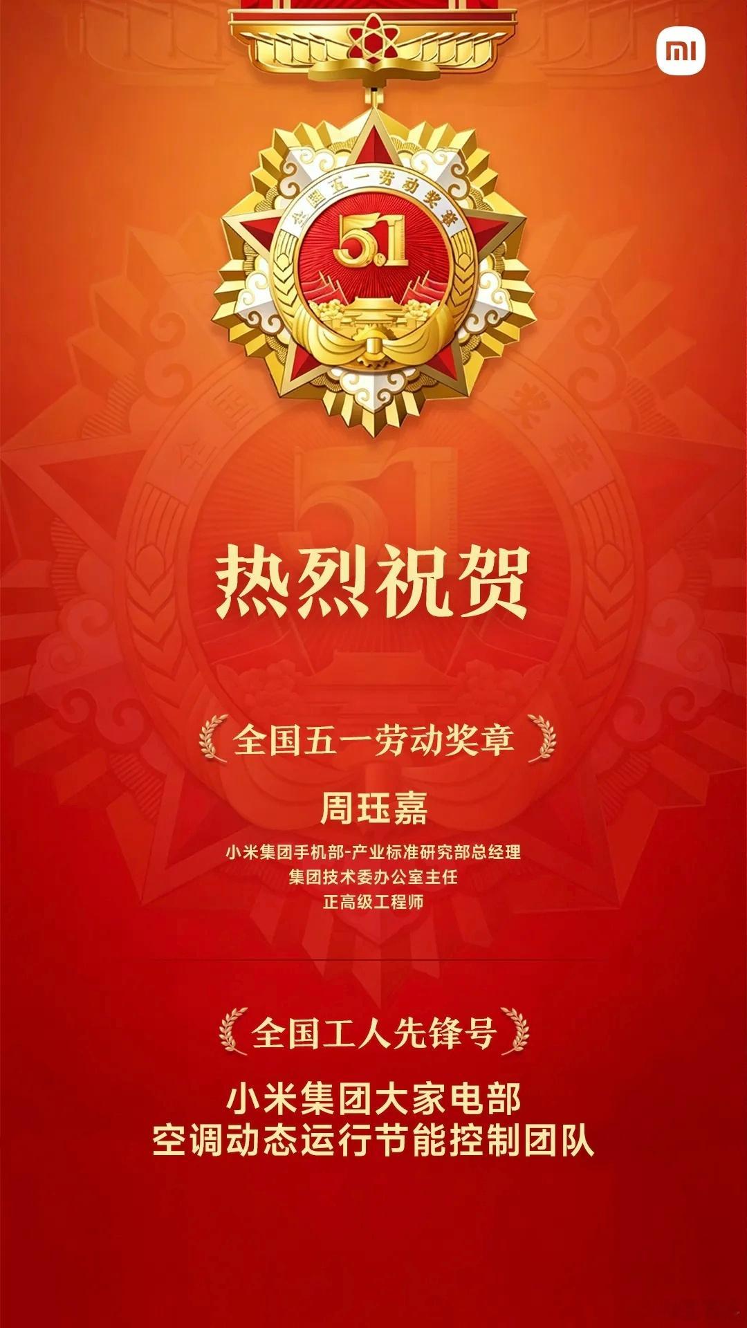小米员工获全国五一劳动奖小米集团空调动态运行节能控制团队,获全国工人先锋号集体。