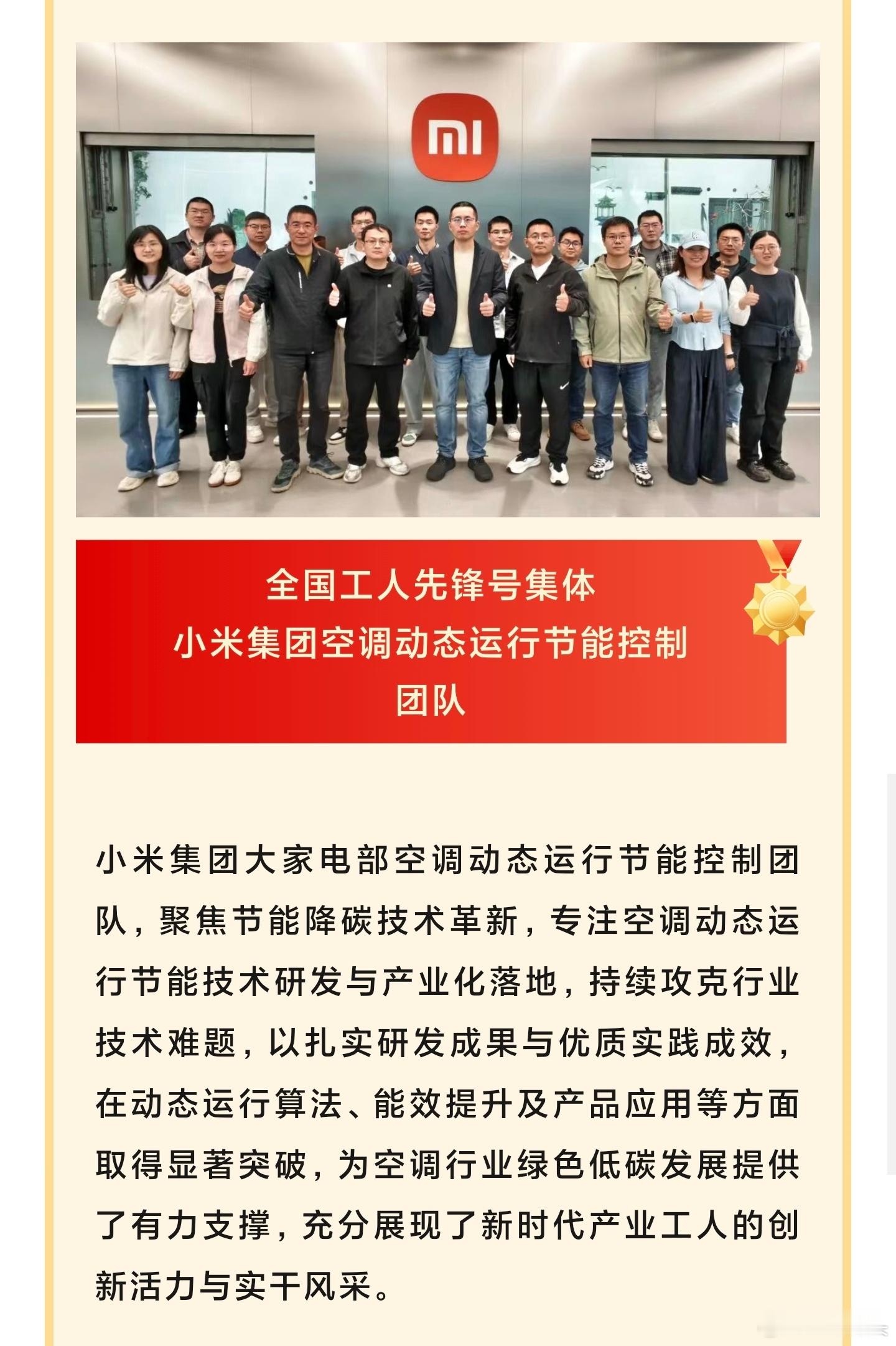 小米员工获全国五一劳动奖小米集团空调动态运行节能控制团队,获全国工人先锋号集体。划重点,空调相关团队。空调,空调。天塌了。