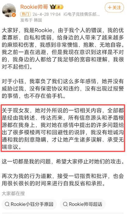Rookie道歉 真是纯渣男啊分手了还一直逼逼叨叨说前女友坏话这不是纯人品问题吗?现女友也是傻 听风就是雨难道不知道他今天能贬低前女友明天也能贬低你吗?hhhhhh