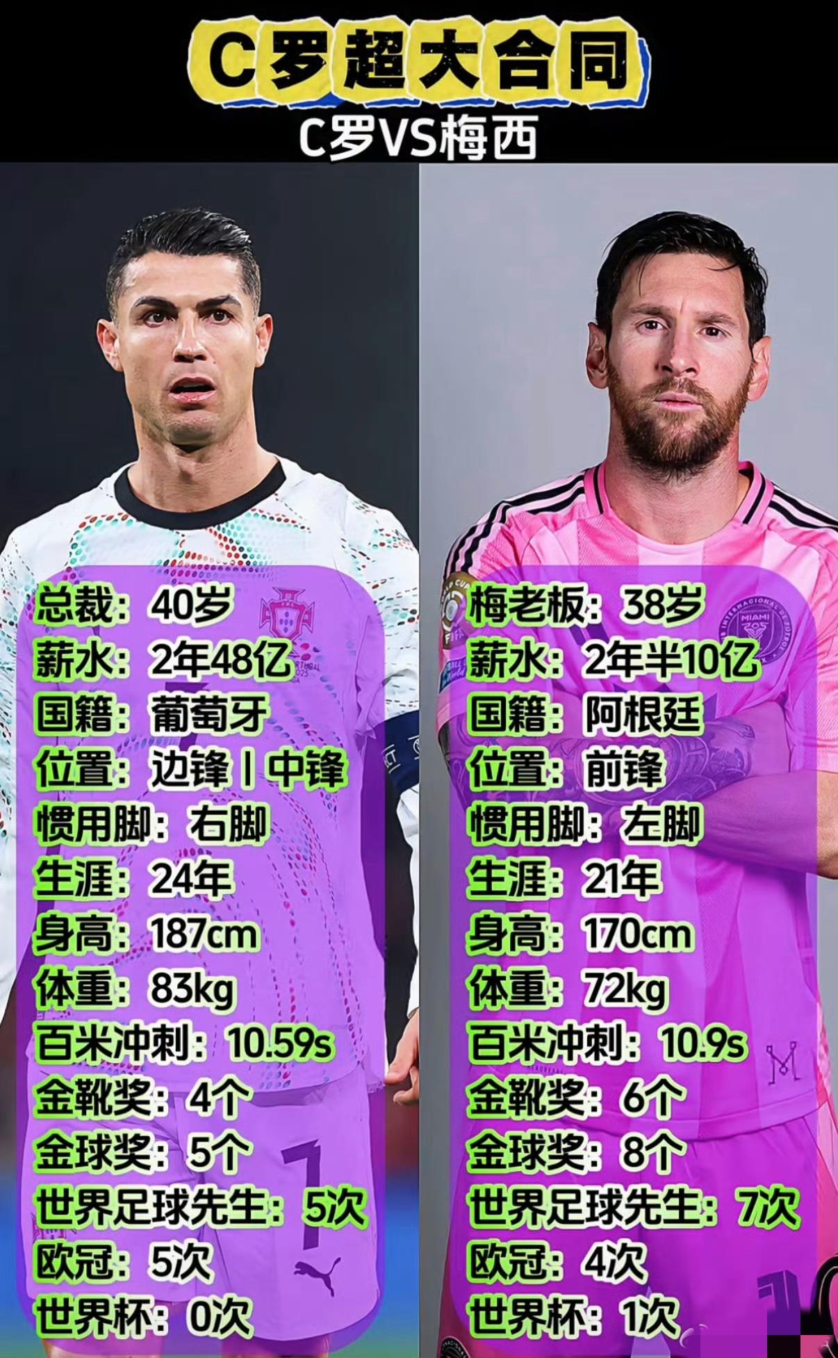 FIFA世界杯在ins上更新了这样一幅图(图一),令人意味深长。 图二:总裁与梅老板各方面对比,论赚钱,总裁遥遥领先。 图三:虽然都在自家友谊赛踢球,但两人进球还是有一点点差距。总裁每83.5分钟进一个球,梅老板每63分钟进一个球。