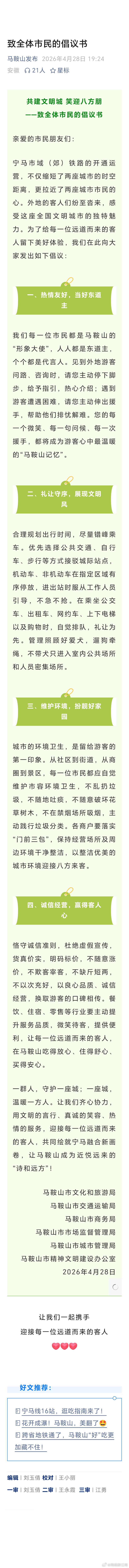 宁马市域(郊)铁路的开通运营,不仅缩短了两座城市的时空距离,更拉近了南京、马鞍山两座城市市民的心。外地的客人们纷至沓来,感受马鞍山市这座全国文明城市的独特魅力--马鞍山市《致全体市民一封信》美话马鞍山