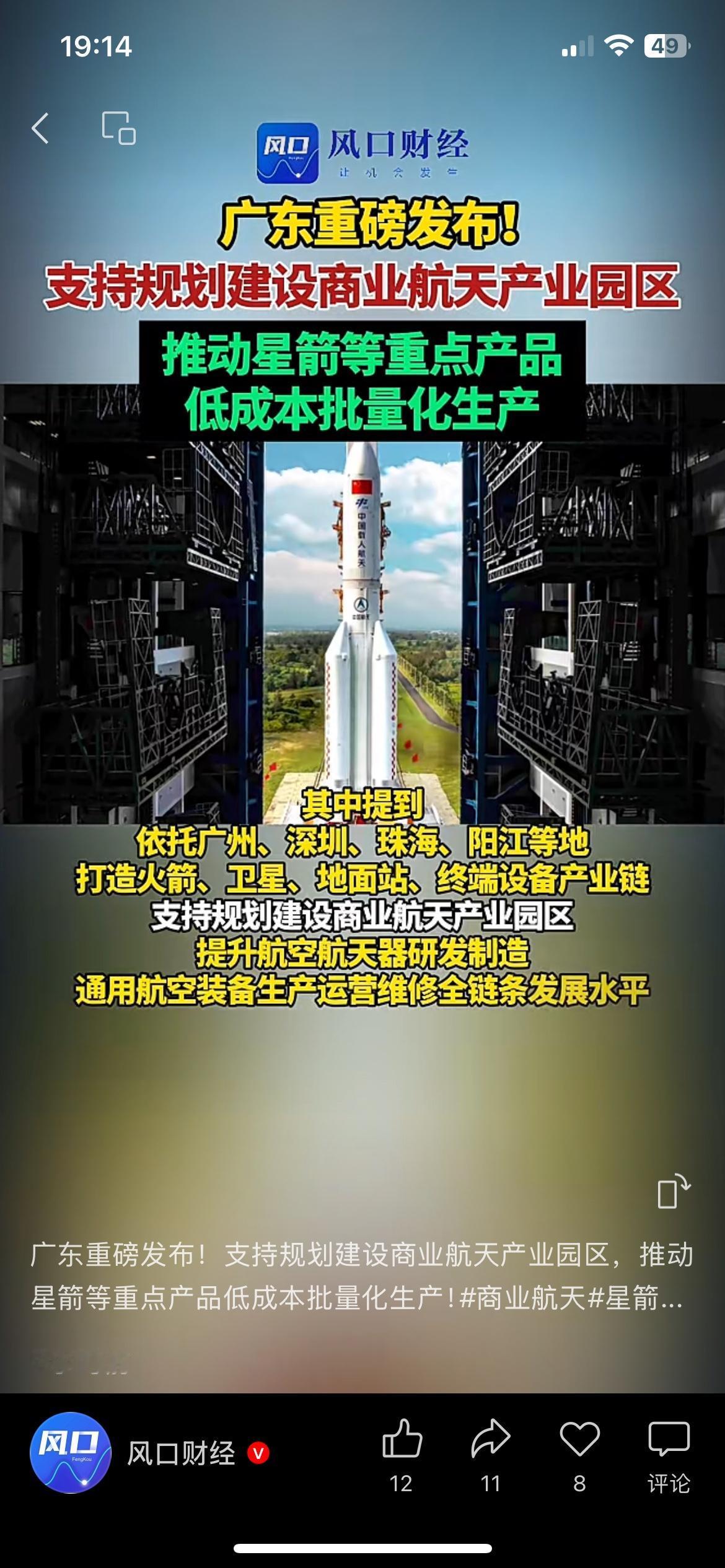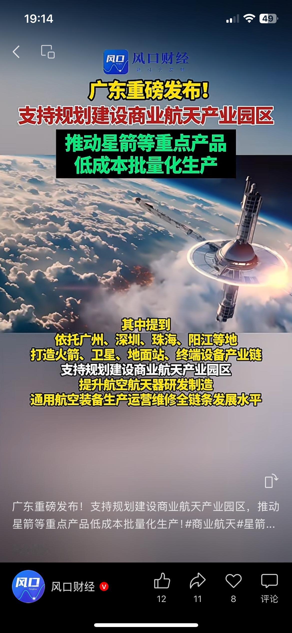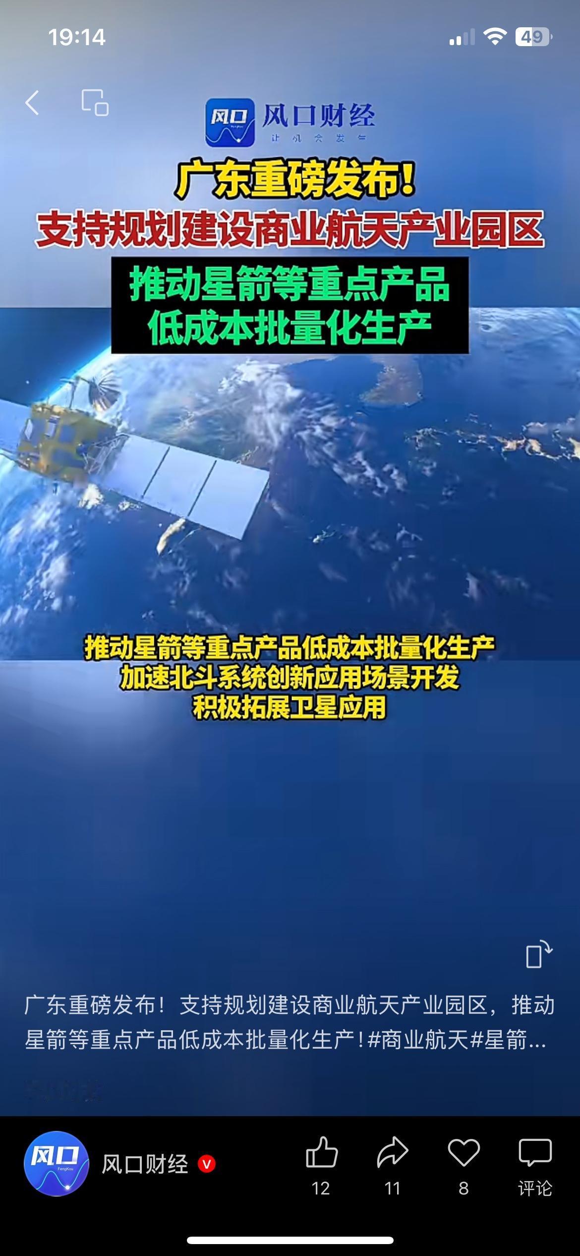 广东加码商业航天布局,火箭卫星量产落地,新兴赛道迎来风口 广东重磅落地商业航天扶持政策,全力打造本土航天产业园。 推动火箭、卫星规模化量产,压缩成本,拓宽民用应用场景。 看似遥远的航天产业,慢慢融入导航、通信、民生服务。 新兴产业快速崛起,也会带动就业、技术、区域经济同步升级。 冷门赛道慢慢大众化,未来会诞生不少全新机会。 你看好国内商业航天,长期的发展潜力吗