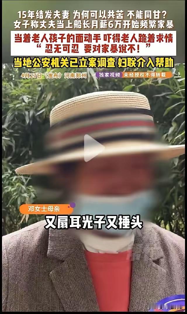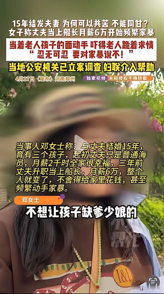 船长上岸家暴起:15年结发情,为何难抵同甘劫 4月27日,河南郑州的调解现场,邓女士的泪水一次次打湿纸巾。15年结发夫妻,从一无所有到月薪6万的船长丈夫,她陪他熬过苦日子,却没熬过“同甘”的劫——丈夫升职后,温柔褪去,家暴频发,最终让她忍无可忍,决心对家暴说不。 邓女士与丈夫的婚姻,始于一穷二白。那时丈夫是普通船员,月薪仅2000元,却将全部收入上交家用。日子紧紧巴巴,她省吃俭用,独自扛起家庭重担:照顾老人、抚养三个孩子、打理所有家务,一分一毫都不敢乱花。丈夫满心愧疚,总承诺“一定让你过上好日子”,这份承诺,是邓女士熬过苦日子的全部支撑。 丈夫确实兑现了承诺。多年打拼后,他晋升船长,薪资翻倍至月薪6万元,家里彻底摆脱拮据 。可生活变好的同时,人心却变了。丈夫回家后处处挑剔,嫌弃邓女士朴素节俭,嘲讽她“又土又胖”,甚至拿亲生女儿的长相宣泄不满,往日的温柔被冷漠、刻薄取代。 语言打压很快升级为肢体暴力。为了孩子不缺爹少娘,邓女士选择隐忍,可她的退让,反而助长了丈夫的嚣张气焰——一点琐事不顺心,就对她大打出手,甚至不再避讳老人和孩子。最让她崩溃的一次,母亲前来探望,丈夫因小事当着母亲的面抓着她的头发,又扇耳光又捶头,嘴里不停咒骂。邓女士一边忍痛哀求,一边担心吓到母亲,母亲吓得颤抖着拉拽女婿,最终扑通跪下恳求,女儿也哭着冲上来护着她,丈夫却狂言“老子还敢”。 看着母亲颤抖的身影、女儿勇敢的模样,邓女士彻底醒悟:隐忍换不来珍惜,只会让伤害变本加厉。她鼓起勇气求助调解员,决心用法律捍卫自己和孩子。 事实上,丈夫的行为早已触碰法律红线。《反家庭暴力法》第二条明确规定,家庭成员之间以殴打、经常性谩骂、恐吓等方式实施的身体、精神侵害,均属家暴,国家禁止任何形式的家庭暴力 。邓女士遭遇的殴打、辱骂,正是典型的家暴行为 。 而《民法典》为邓女士提供了明确的维权路径:夫妻一方实施家暴,另一方要求离婚的,可向法院提起诉讼,调解无效的,应当准予离婚 。一旦认定家暴事实,法院会支持离婚,无过错方还可主张离婚损害赔偿,财产分割也会优先照顾女方和无过错方 。 目前,当地公安机关已正式立案调查,妇联也第一时间介入,为邓女士提供帮助与保护 。 15年风雨同舟,从挤在小屋里的清贫到手握高薪的安稳,邓女士陪丈夫走过人生低谷,却没料到上岸后的日子满是伤痕。她的遭遇,也让我们看清一个残酷真相:家暴只有零次和无数次,婚姻的底线从来是尊重与珍惜。当暴力降临,勇敢说不,才是对自己和家人最好的保护。