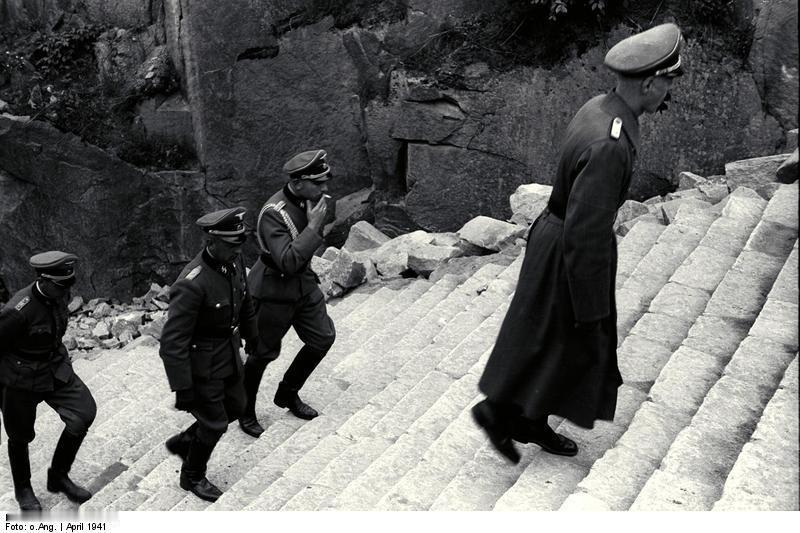 1941年4月27日,海因里希·希姆莱视察了位于奥地利的毛特豪森集中营。此次视察是希姆莱在集中营运营期间多次巡视该营地的其中一次。毛特豪森集中营位于上奥地利州林茨以东约20公里处,于1938年8月奥地利被德国吞并后建立。到1941年,它已成为一个不断扩张的附属营地网络的中心营地,其中古森集中营(距离约5公里)是规模最大、最重要的卫星营地。希姆莱于1941年4月的视察被党卫军摄影师拍摄的一系列照片详细记录下来,这些照片在战争中幸存下来,现藏于包括联邦档案馆和毛特豪森纪念馆在内的多个档案馆中。这些照片显示,希姆莱视察了维也纳地堑花岗岩采石场,这是集中营的经济命脉。陪同他的是集中营指挥官弗朗茨·齐雷斯、上奥地利地区大区长官奥古斯特·艾格鲁伯、党卫队高级集团领袖恩斯特·卡尔滕布鲁纳(时任维也纳党卫队和警察最高领导人)以及集中营监察局和党卫队经济管理部门的多名官员。部分照片显示希姆莱站在采石场顶端,俯瞰下方劳作的囚犯;另一些照片则1941年4月27日,海因里希·希姆莱视察了位于奥地利的毛特豪森集中营。此次视察是希姆莱在集中营运营期间多次巡视该营地的其中一次。毛特豪森集中营位于上奥地利州林茨以东约20公里处,于1938年8月奥地利被德国吞并后建立。到1941年,它已成为一个不断扩张的附属营地网络的中心营地,其中古森集中营(距离约5公里)是规模最大、最重要的卫星营地。希姆莱于1941年4月的视察被党卫军摄影师拍摄的一系列照片详细记录下来,这些照片在战争中幸存下来,现藏于包括联邦档案馆和毛特豪森纪念馆在内的多个档案馆中。这些照片显示,希姆莱视察了维也纳地堑花岗岩采石场,这是集中营的经济命脉。陪同他的是集中营指挥官弗朗茨·齐雷斯、上奥地利地区大区长官奥古斯特·艾格鲁伯、党卫队高级集团领袖恩斯特·卡尔滕布鲁纳(时任维也纳党卫队和警察最高领导人)以及集中营监察局和党卫队经济管理部门的多名官员。部分照片显示希姆莱站在采石场顶端,俯瞰下方劳作的囚犯;另一些照片则显示他视察了臭名昭著的“死亡阶梯”,这条由186级石阶组成的阶梯,囚犯们被迫扛着重达50公斤的花岗岩石块拾级而上。此次视察正值集中营发展史上的一个重要时期。 1941年1月,莱因哈德·海德里希领导的德国国家安全总局(RSHA)正式将毛特豪森集中营列为整个集中营系统中唯一的三级集中营(Stufe III),这是最严酷的级别,专门关押被视为“无可救药”的帝国敌人的囚犯,其目的在于“劳动灭绝”(Vernichtung durch Arbeit)。希姆莱的视察似乎部分是为了检查党卫军旗下的德国土石工程有限公司(DEStG)的采石作业,该公司向阿尔伯特·施佩尔的建筑项目出售石料;部分是为了审查集中营的扩建计划。古森集中营和主营的新建设工程正在进行中,随着大量西班牙共和党人、波兰政治犯和其他囚犯的到来,囚犯人数迅速增长。此次视察之后发生了一系列重大事件。几个月后,毛特豪森集中营开始接收苏联战俘(1941年秋季,该集中营开始大规模处决苏联战俘),主营区的毒气室也于1941年至1942年间建成。到1945年5月5日美军解放该集中营时,至少有9万人死于毛特豪森及其附属营地,一些估计认为死亡人数远高于此。1941年拍摄的照片是希姆莱在集中营环境中被广泛传播的图像之一,并经常用于大屠杀教育,以直观地展现希姆莱的暴行。纳粹高层领导人亲自参与集中营系统的运作。影片展现了希姆莱冷静地观察着他及其下属精心设计的致命环境。显示他视察了臭名昭著的“死亡阶梯”,这条由186级石阶组成的阶梯,囚犯们被迫扛着重达50公斤的花岗岩石块拾级而上。此次视察正值集中营发展史上的一个重要时期。 1941年1月,莱因哈德·海德里希领导的德国国家安全总局(RSHA)正式将毛特豪森集中营列为整个集中营系统中唯一的三级集中营(Stufe III),这是最严酷的级别,专门关押被视为“无可救药”的帝国敌人的囚犯,其目的在于“劳动灭绝”(Vernichtung durch Arbeit)。希姆莱的视察似乎部分是为了检查党卫军旗下的德国土石工程有限公司(DEStG)的采石作业,该公司向阿尔伯特·施佩尔的建筑项目出售石料;部分是为了审查集中营的扩建计划。古森集中营和主营的新建设工程正在进行中,随着大量西班牙共和党人、波兰政治犯和其他囚犯的到来,囚犯人数迅速增长。此次视察之后发生了一系列重大事件。几个月后,毛特豪森集中营开始接收苏联战俘(1941年秋季,该集中营开始大规模处决苏联战俘),主营区的毒气室也于1941年至1942年间建成。到1945年5月5日美军解放该集中营时,至少有9万人死于毛特豪森及其附属营地,一些估计认为死亡人数远高于此。1941年拍摄的照片是希姆莱在集中营环境中被广泛传播的图像之一,并经常用于大屠杀教育,以直观地展现希姆莱的暴行。