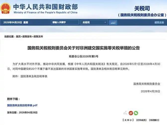 中国给非洲53国全免关税了,这到底是怎么回事 2026年5月1日起,中国对53个非洲建交国全面实施零关税。简单说,就是这些国家大部分商品卖到中国,不用交关税了。 这事其实分两步走。第一步,2024年12月起,33个非洲最不发达国家已经先享受了100%零关税;第二步,今年5月1日起,剩下的20个非洲国家也加入进来,通过特惠税率的形式实现零关税,为期两年。 为什么要这么做?王毅外长打过一个比方:关税做减法,贸易做加法,老百姓的日子做乘法。非洲的咖啡、鲜花、腰果、芝麻,能更便宜地进入中国市场,咱们消费者得实惠,非洲的生产者能赚钱,两头受益。 有人担心,零关税会不会冲击国内产业?其实不会。这些东西中国本来产量就少,像肯尼亚的玫瑰、埃塞俄比亚的咖啡、几内亚比绍的腰果,反而是填补了我们市场的空白。 还有一点值得注意,零关税不等于所有商品完全不交税。部分配额外的商品仍按原来税率走,这是一个有分寸的安排,既要帮非洲,也要符合国际规则。 中国是第一个对所有非洲建交国实现全覆盖零关税的主要经济体。而且不附加任何政治条件,也不要求对方对等开放。2025年中非贸易额已经达到3480亿美元,2026年一季度中国自非洲进口又增长了14.6%,这个政策的效果正在显现。 一句话总结:这不是施舍,是合作;不是做样子,是真开门。