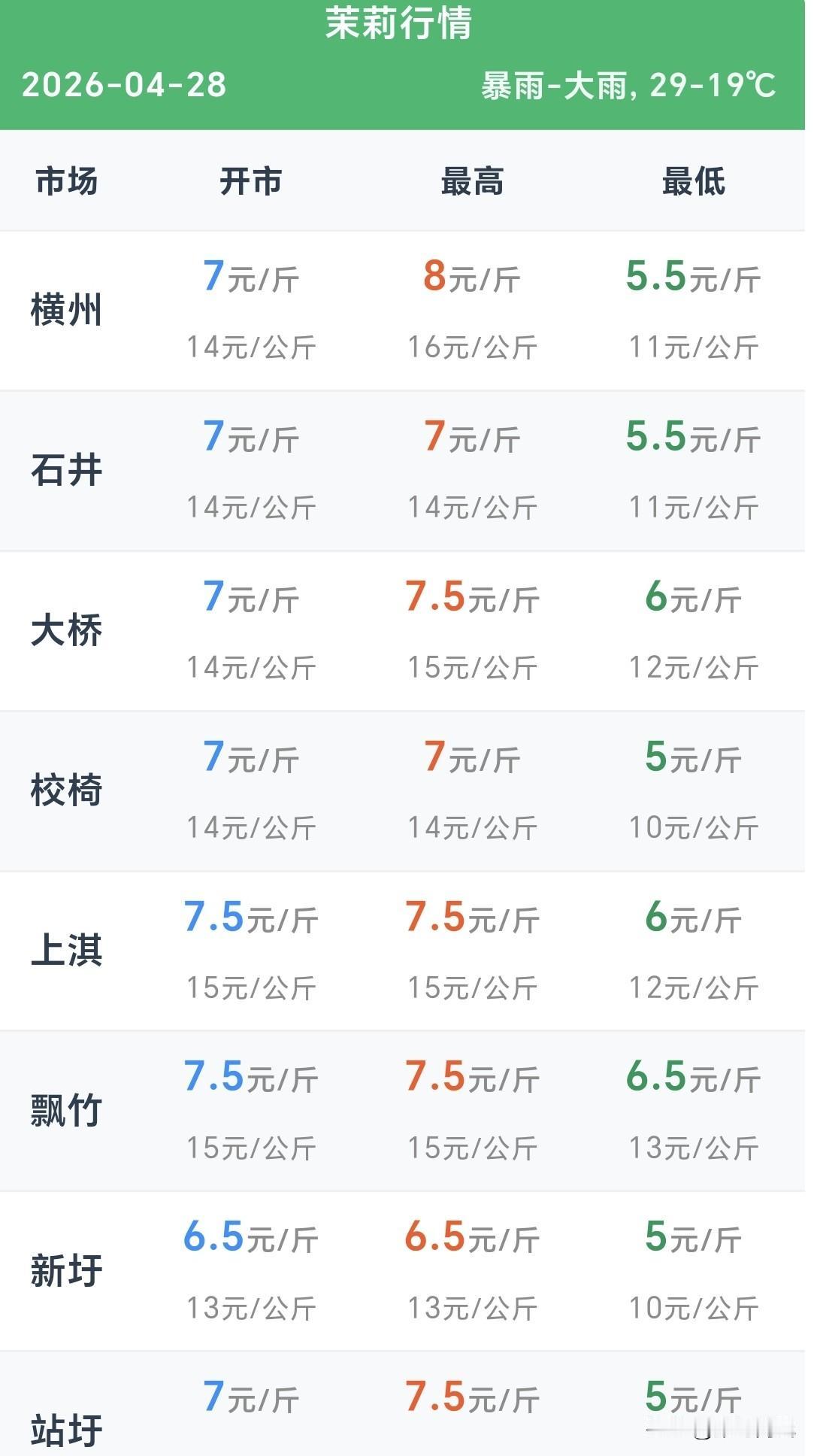 时间:2026年4月28日 地点:广西南宁横州市 今天早上7:20开始下雨,到8:40的时候停雨,后来太阳就出来了,太阳出来之后,群众们就去摘花了,为了不浪费,价格便宜也要去摘花,得一块是一块,现在这个市场行情,有收入好过没收入。 下午市场里面开价是8块钱,也有9块的,后来到6:40的时候,价格是6.5元,总体来说质量还是可以的,但是数量极少,今晚没有出现前几天抢花的现象。 我觉得,现在这个茉莉花,已经到了陆续摘花的阶段了,不管价格怎么样,忽高忽低,还是要继续采摘,要不就浪费了,最起码有点微薄的收入,能够维持基本的生活开支,已经是很不错的了。 如果是你,会来我们这里体验采摘茉莉花吗? 横州茉莉花 横州茉莉花价 茉莉花采摘