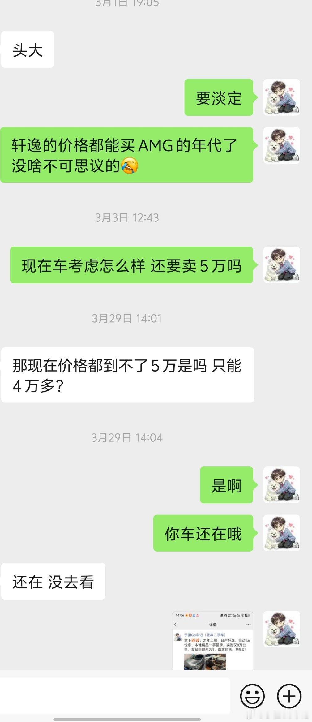 图2-3:一台20年上牌的尼桑轩逸,8万多公里检测过不了,上个月给他出4.3结果家里商量完决定继续放着,今天又在说要卖,这车现在4万吧回来还得整备2000左右