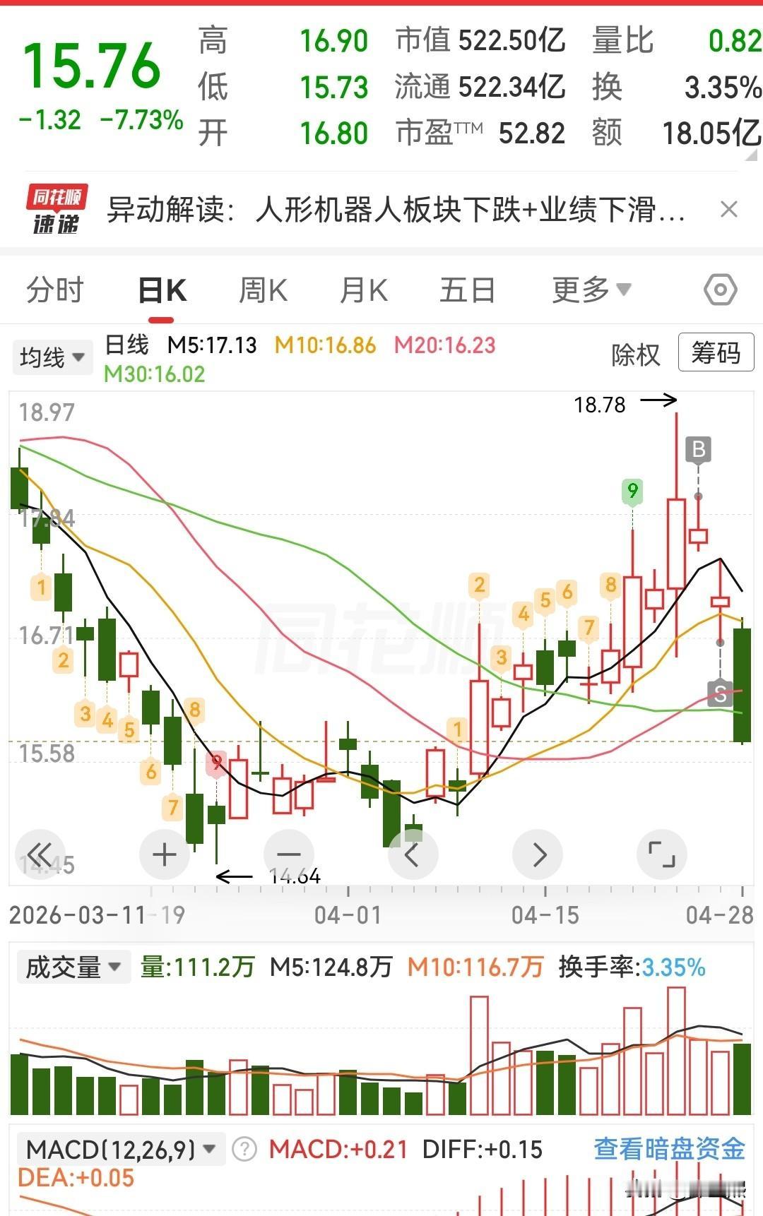 还好跑的快,不然就真的被埋了。 这个货在买入的时候感觉趋势还是不错的,而且走势比板块强,于是在尾盘搞了一点,结果第二天就给了一巴掌,有点晕啊,明明走的好好的,为什么突然向下了?是补仓还是割肉?确实犹豫了半天,最后还是选择放弃。今天再看,公布的一季报比较差,直接大跌7个多点,幸好走的还算是及时。
