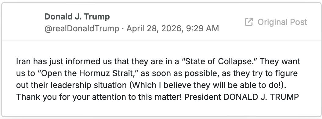 北京时间今日21时29分,特朗普发帖称:“伊朗刚刚通知我们,他们正处于‘崩溃状态’。他们希望我们尽快‘开放霍尔木兹海峡’,同时他们试图解决他们的领导层问题(我相信他们将能够做到!)。感谢您对此事的关注!唐纳德·J·特朗普总统。”