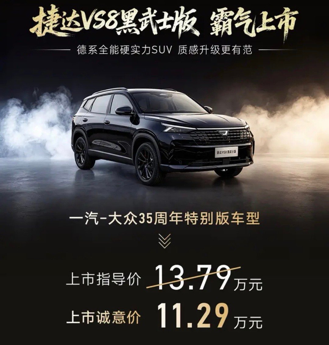 【捷达VS8黑武士版正式上市 上市诚意价11.29万元】今日,捷达官宣捷达VS8黑武士版正式上市,官方指导价13.79万元,上市诚意价11.29万元。车身尺寸方面,新车长宽高分别为 4629×1851×1624mm,轴距达2731mm,后备厢常规容积654L。