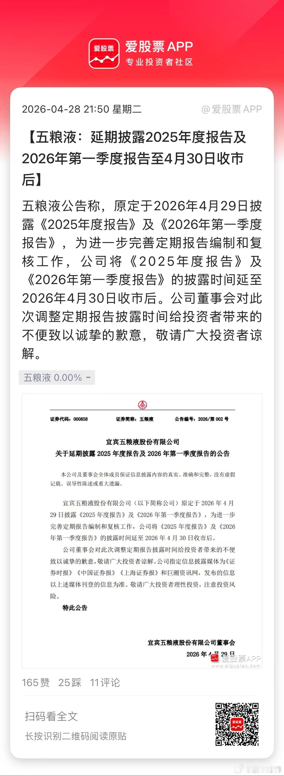 浓眉大眼的白酒二哥,竟然延后发年报和季报,A股主流白酒没有这样的先例!所以这是要干嘛,是惊喜还是惊吓呢?机构预测一季度是-27%,不会比这更差吧。五粮液账上1400亿现金,哪怕业绩差。如果加大分红+回购,大家也是可以原谅的!毕竟股价已经趴在地板上了。(爱股君)