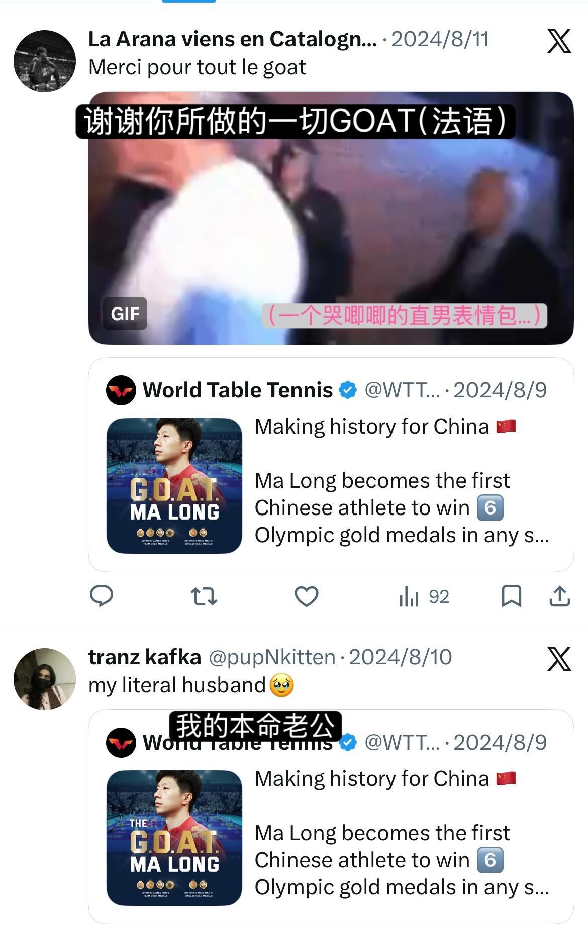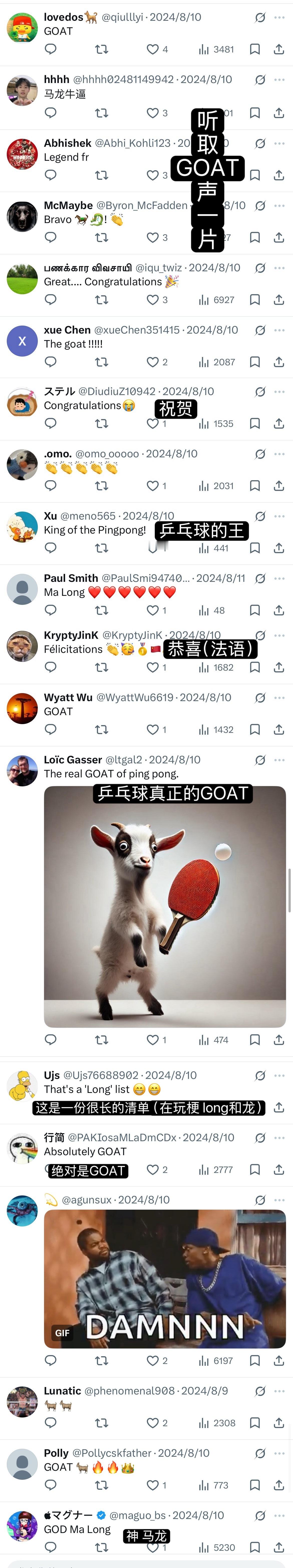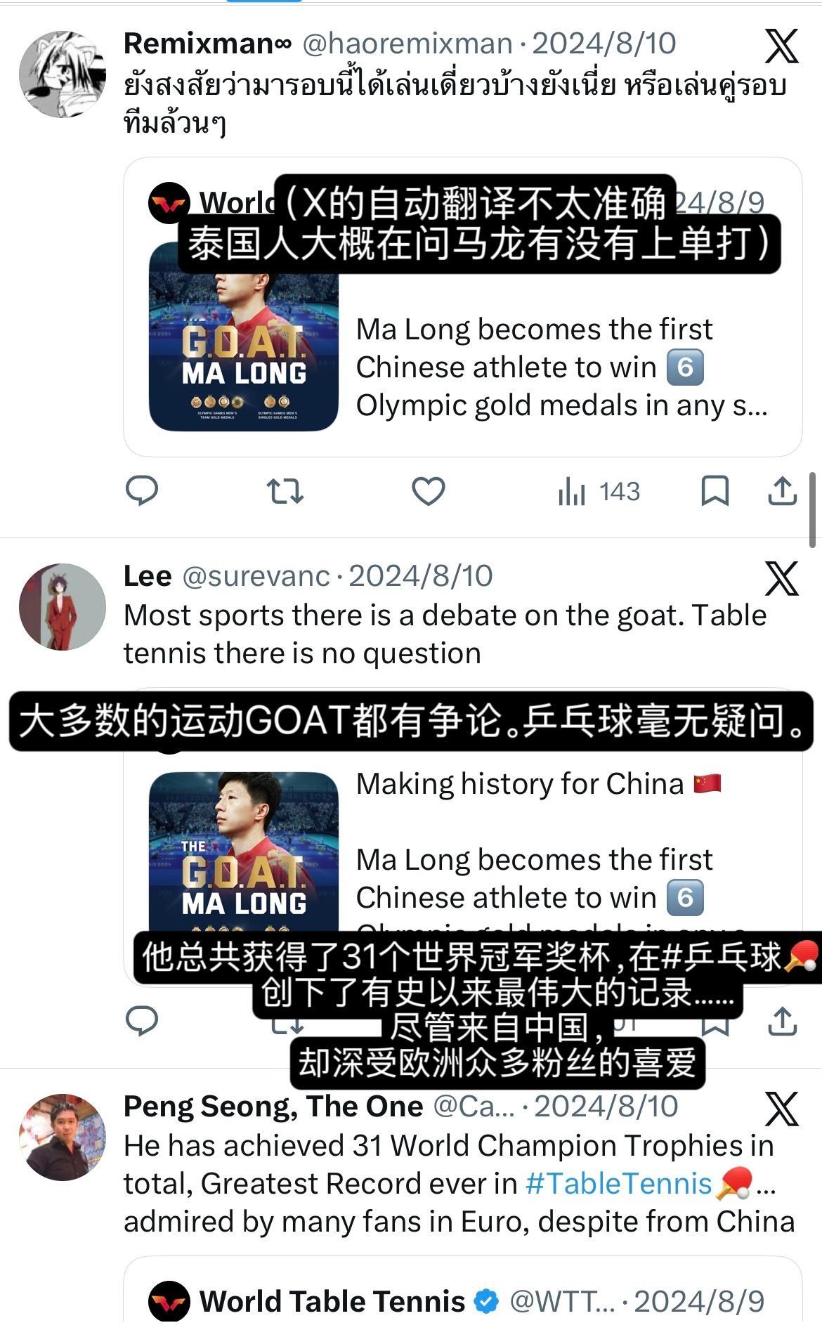 国际乒联称马龙是goat X上巴黎后马龙有一篇63w阅读量将近万赞的热帖,节选了一些评论和引用大概翻译了一下,基本都是各国球迷在感慨GOAT的伟大🥳(WTT平常转赞过50都很难翻了一下几乎是外网热度最高的帖子了😎)马龙
