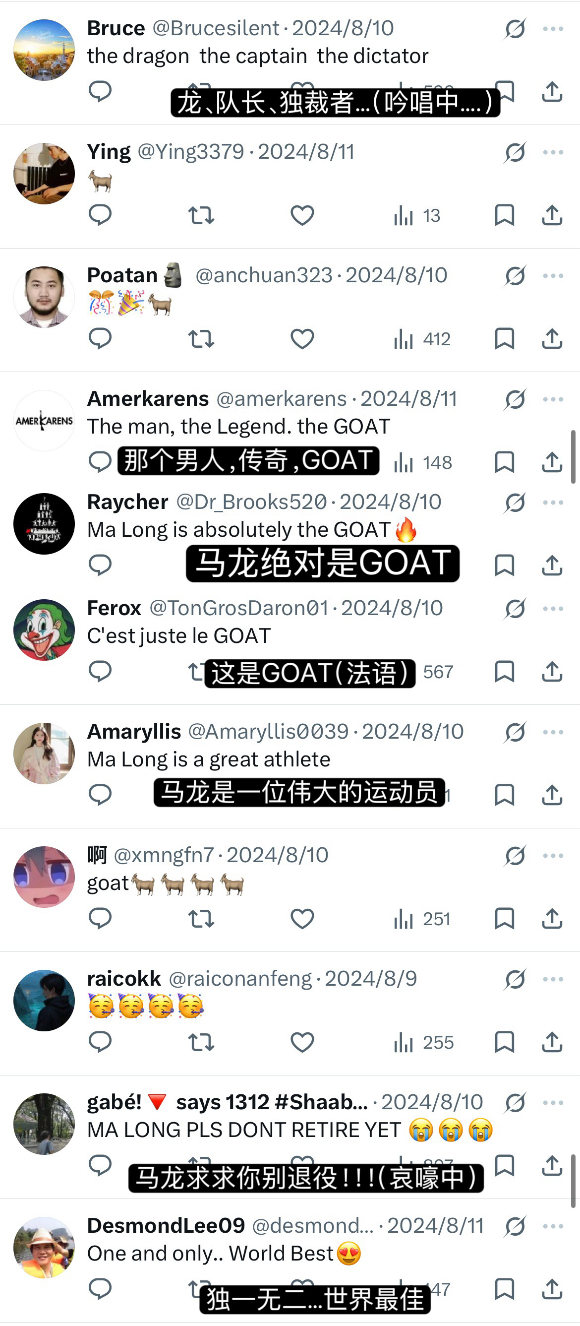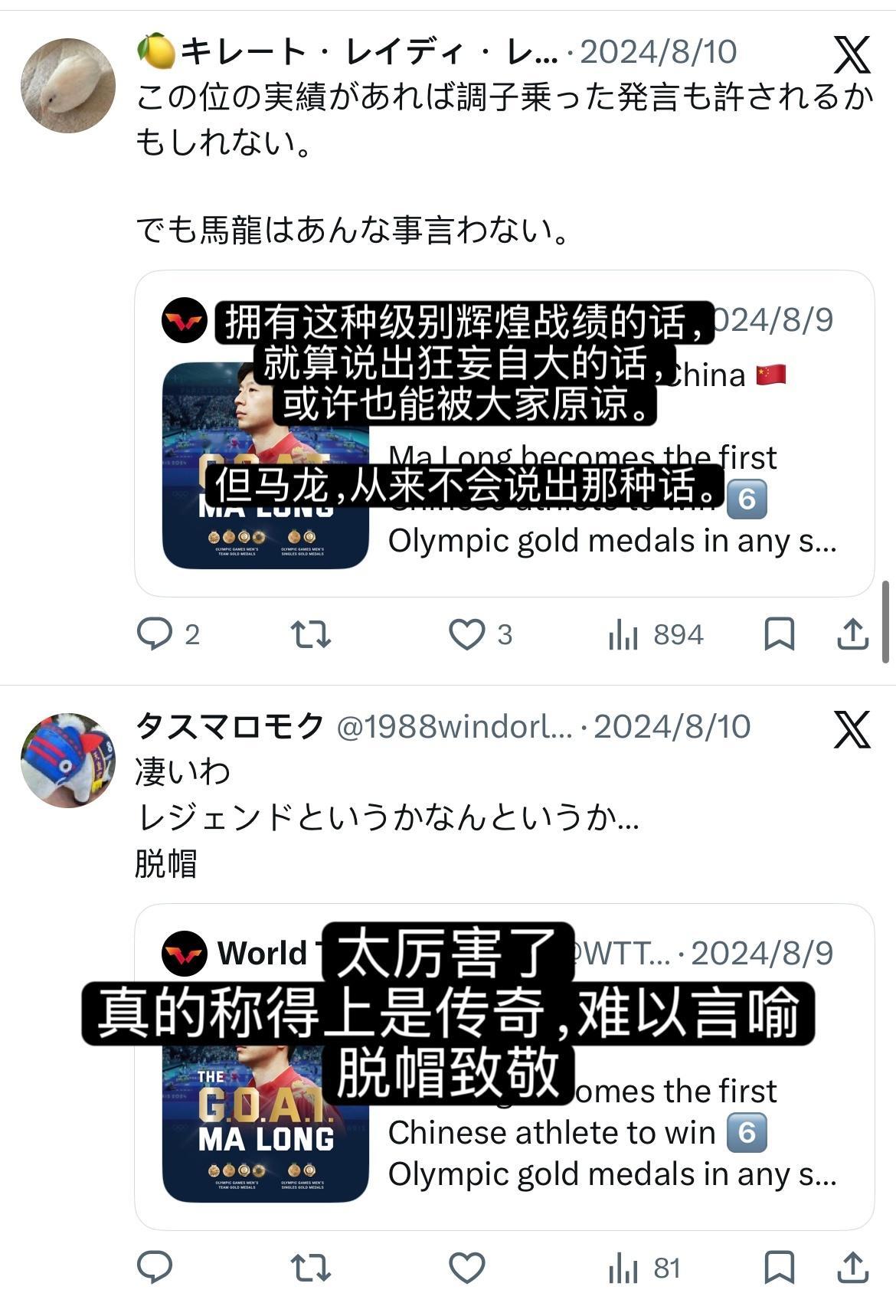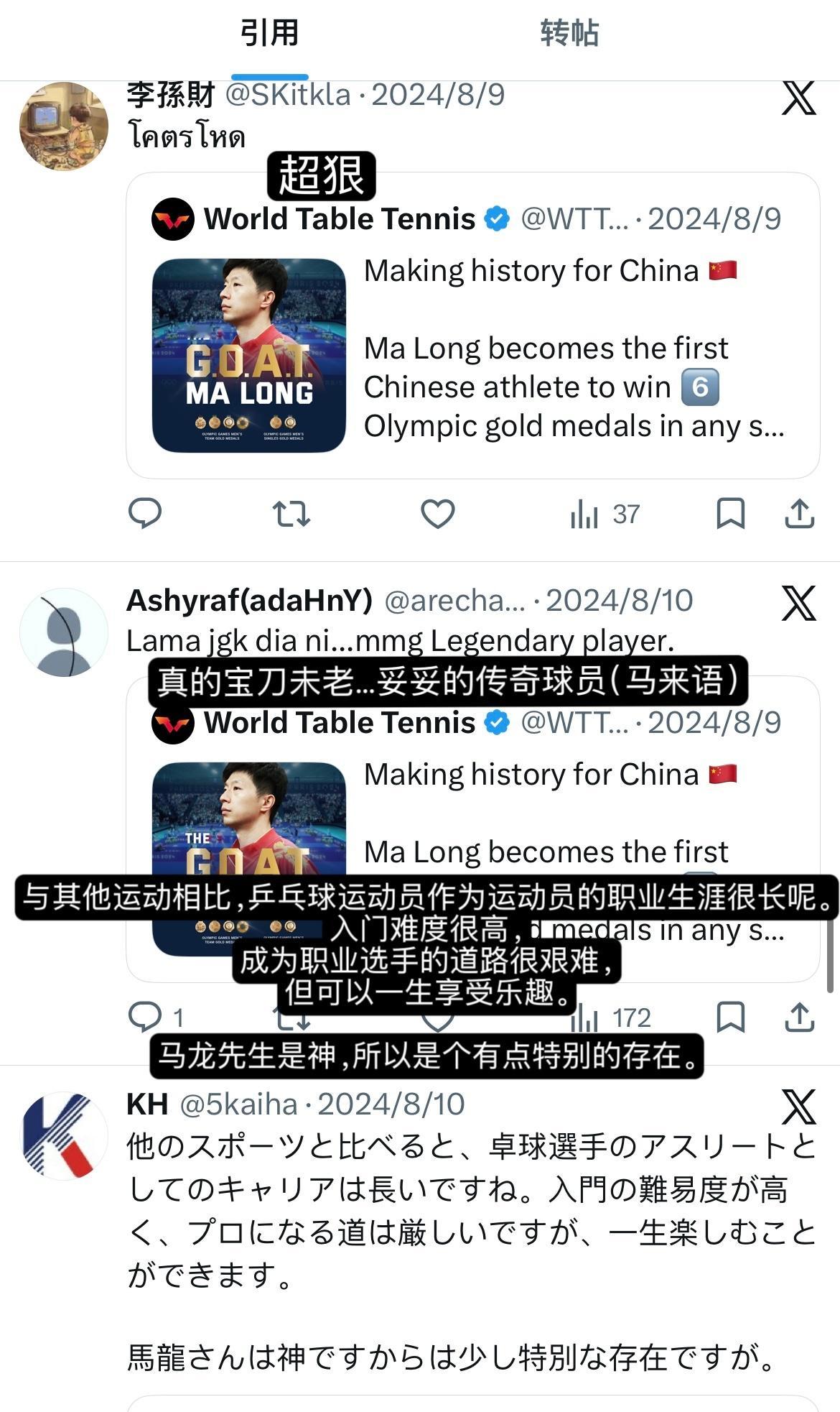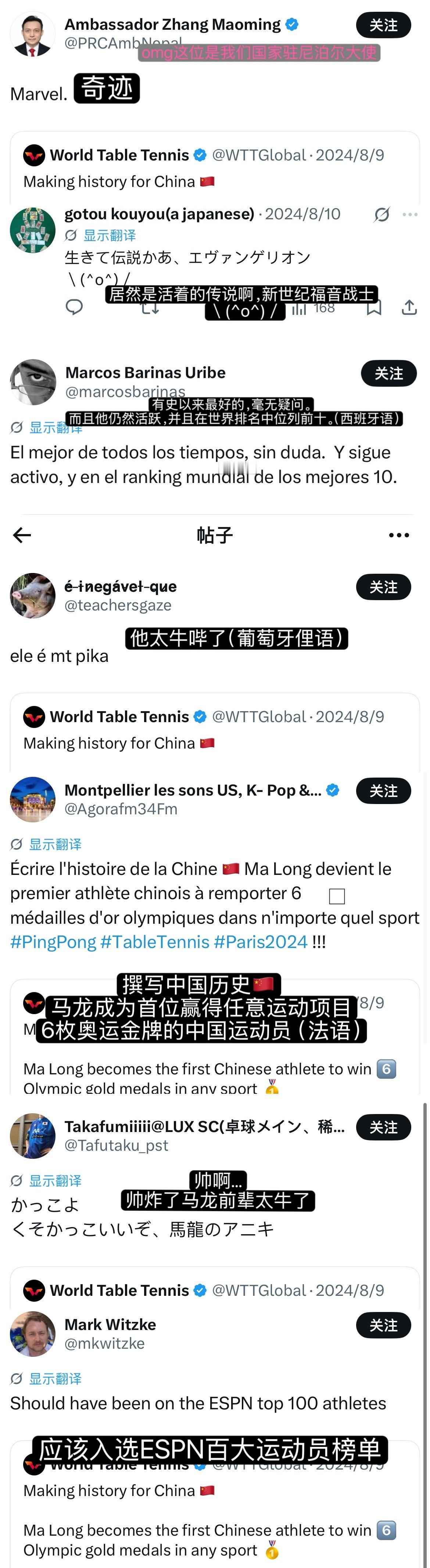 国际乒联称马龙是goat X上巴黎后马龙有一篇63w阅读量将近万赞的热帖,节选了一些评论和引用大概翻译了一下,基本都是各国球迷在感慨GOAT的伟大🥳(WTT平常转赞过50都很难翻了一下几乎是外网热度最高的帖子了😎)马龙