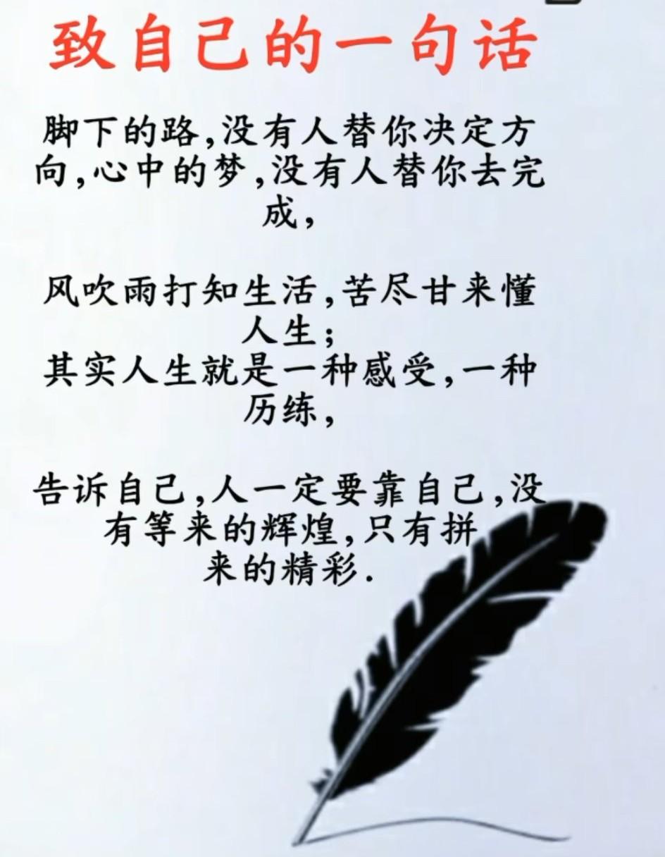 非常通透的一段话:别喊穷,没人会给你钱;别喊累,没有人会帮你做;别落泪,没人在乎你的眼泪;别认输,一堆人等着看你笑话;别靠人,只有自己最可靠。人生总会苦一阵子,但不会苦一辈子,今天多一份拼搏,明天就多几分欢笑。 别人帮你是情分,不帮你是本分,别去抱怨因为改变不了什么。记住,求人如吞三尺剑,靠人如上九重天,哪里跌倒,就要在哪里爬起来,心中有光,何惧人生风霜。 靠天不如靠己,靠人先要靠自己,好子不贪爷田地,好女不贪嫁时衣。引路靠贵人,走路靠自己成长靠经历,渡人先渡己。