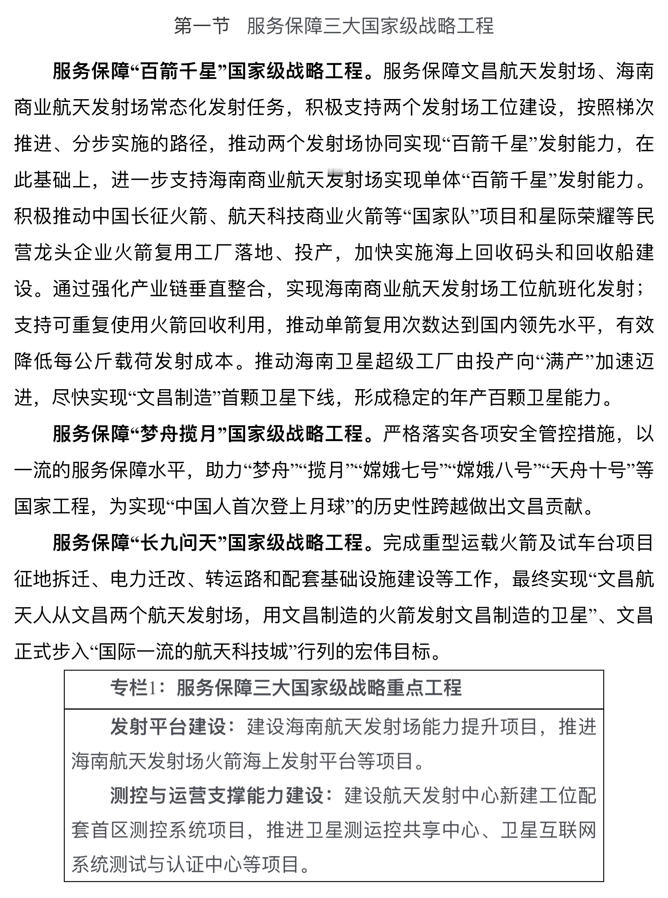 ●服务保障“百箭千星”国家级战略工程。服务保障文昌航天发射场、海南商业航天发射场常态化发射任务,积极支持两个发射场工位建设,按照梯次推进、分步实施的路径,推动两个发射场协同实现“百箭千星”发射能力,在此基础上,进一步支持海南商业航天发射场实现单体“百箭千星”发射能力。积极推动中国长征火箭、航天科技商业火箭等“国家队”项目和星际荣耀等民营龙头企业火箭复用工厂落地、投产,加快实施海上回收码头和回收船建设。通过强化产业链垂直整合,实现海南商业航天发射场工位航班化发射;支持可重复使用火箭回收利用,推动单箭复用次数达到国内领先水平,有效降低每公斤载荷发射成本。推动海南卫星超级工厂由投产向“满产”加速迈进,尽快实现“文昌制造”首颗卫星下线,形成稳定的年产百颗卫星能力。