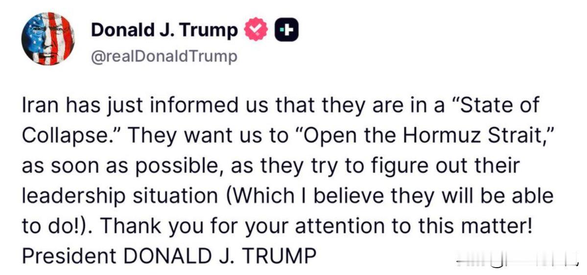 特朗普称伊朗希望美国开放霍尔木兹海峡! 老特又开始吹嘘了吗?还是给他找台阶?4月28晚间快讯, 大家好,这里是专注国际局势动态的 【煋星论长风】,美伊停火已经有一段时间了,然而美伊的谈判到了现在依然是僵局状态,就在不久前特朗普又发表了最新表态称伊朗希望美国开放霍尔木兹海峡。以下是详细情况! 1、据美国福克斯新闻网信息显得,最新消息:特朗普总统称,伊朗告诉他,伊朗正处于“崩溃状态”,并希望美国尽快开放霍尔木兹海峡。 2、据美国媒体axios媒体信息显示,特朗普在处理伊朗问题上正权衡两条道路:要么升级军事打击,要么继续实施“极限施压”制裁以迫使伊朗进行谈判。 他有时态度强硬,曾对一位顾问说:“伊朗领导人只听得懂炸弹。” 但顾问们表示,他对真正发动新的袭击仍然持谨慎态度。正如一位顾问所说,他“感到沮丧但很现实……他不想动用武力,但他也不会退缩。” 综合观察来看【煋星观察】,老特我发现每天不进行吹牛,那就不是老特了。白宫晚宴枪击事件吹牛,伊朗战争吹嘘了多久了,每次被伊朗打脸。到了现在伊朗都不想与美国谈判了。老特之前说的最后谈判期限,现在都不说了。现在老特这样说,很有可能是老特在给自己找台阶,这样老特就有理由开放霍尔木兹海峡了。 关注 【煋星论长风】,每日为你穿透烟幕,看清每一步棋局!