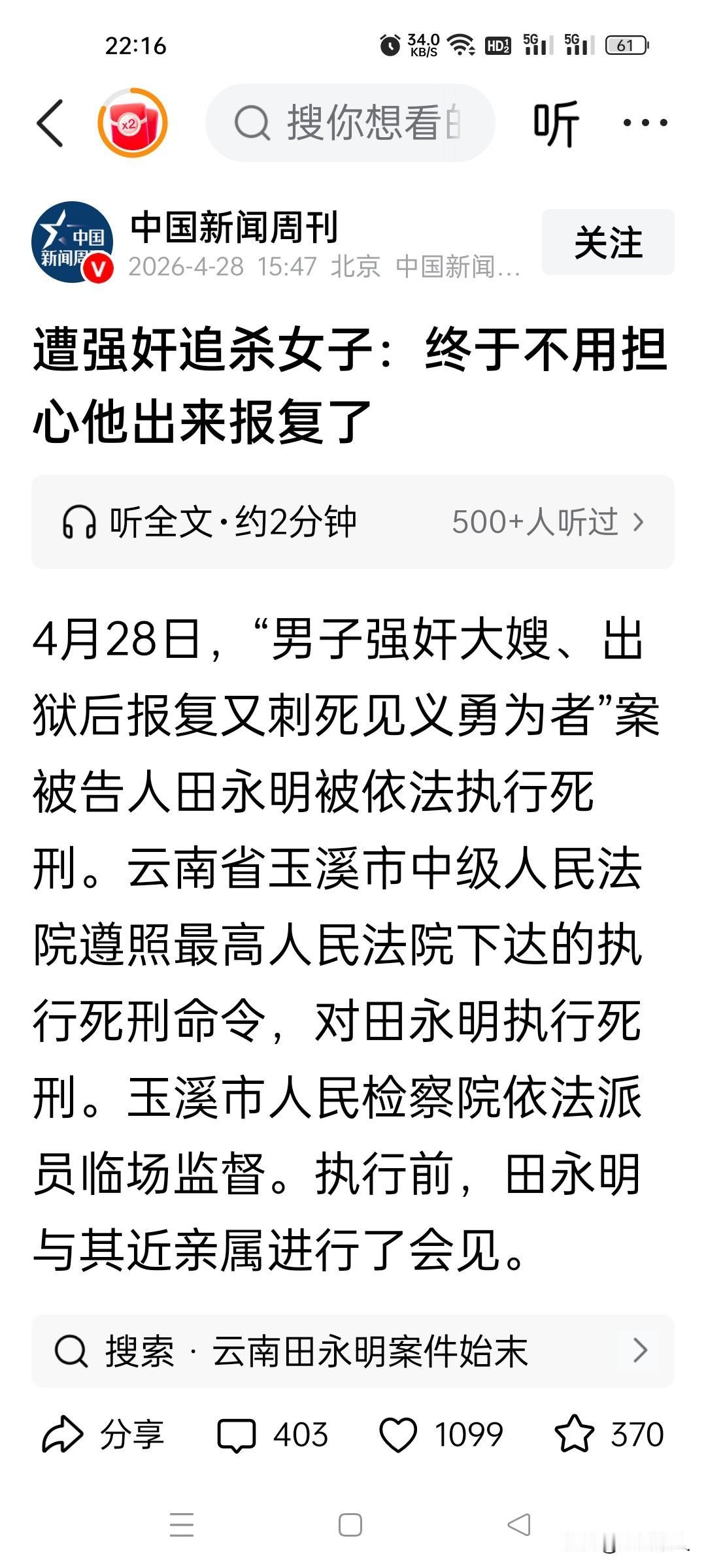 亲情本是世间最温暖的羁绊,兄弟手足、叔嫂和睦,是一个家庭安稳幸福的根基。可在云南玉溪,男子田某却因为一时兽欲,践踏亲情、泯灭人性,先是侵犯大嫂锒铛入狱。 出狱后不知悔改报复行凶,无辜村民惨死刀下,自己亡命天涯躲藏二十年,最终罪恶滔天,难逃法律严惩,在4月28日被依法执行死刑,结束了自己肮脏罪恶的一生。 田某在家里排行最小,从小到大,全家人都对他百般呵护、百般迁就,父母溺爱,兄长更是格外疼爱这个弟弟。大哥成家结婚之后,田某也时常往来大哥家中,吃住玩耍都十分随意。 一家人相处和睦,谁也没有想到,这份深厚的亲情,最后竟然会被他亲手彻底撕碎。随着年纪慢慢增长,田某渐渐懂事,也萌生了男女之情,可他心智不成熟,三观扭曲,最终酿成了无法挽回的悲剧。 时间回到1996年6月,年仅20岁的田某,在欲望驱使下丧失理智。那天大哥外出不在家中,独处的田某一时糊涂、兽欲上头,竟然把邪恶的念头对准了自己的大嫂。 趁着家中无人,他不顾一切扑向大嫂,强行将对方按倒在地,粗暴撕扯大嫂衣物,意图强行与其发生关系。大嫂惊慌失措,拼尽全力反抗挣扎,大声呵斥辱骂田某,誓死不肯屈服。 两人激烈拉扯僵持许久,体力不支的大嫂终究无力抵抗,惨遭小叔子侵犯。事情发生之后,大嫂悲痛欲绝,失声痛哭。丧心病狂的田某害怕丑事败露,担心大嫂把真相告诉大哥,毁掉自己名声。 竟然萌生了杀人灭口的可怕念头,想要直接害死大嫂永绝后患。强烈的求生本能让大嫂拼死反抗,抓住机会拼命逃脱魔爪,侥幸保住性命。脱离危险后,大嫂第一时间选择报警求助。 警方迅速介入调查,很快就将作案潜逃的田某抓捕归案。证据确凿、罪行明确,田某数罪并罚,最终被法院判处有期徒刑9年。 这件丑闻在当地村子里传开之后,大嫂受尽流言蜚语,整日活在屈辱与痛苦之中。明明自己是无辜受害者,可在闭塞的乡村环境里,她处处抬不起头,饱受旁人指点议论。 即便所有人都清楚过错不在她,可她内心始终无法释怀,长期活在阴影与自卑里,精神饱受折磨,日子过得苦不堪言。转眼到了2002年7月,入狱服刑数年的田某获得减刑,提前刑满释放。 得知入狱的小叔子即将回家,大嫂整日惶恐不安、心神不宁,日夜担惊受怕,害怕对方回来报复自己。让人寒心的是,牢狱生涯并没有让田某悔改反省,反而让他心生怨恨。 他从不反思自己禽兽不如的罪行,反而固执认为是大嫂故意揭发、诬陷自己,才让自己大好青春荒废在监狱里,白白受苦多年。回家之后,田某一直怀恨在心,暗中伺机报复,一心想要找大嫂算账出气。 2002年11月,积压已久的怨气彻底爆发,田某随身携带锋利刀具,气势汹汹闯入大嫂家中。原本就极度恐惧大嫂,见到手持凶器的田某,瞬间吓得魂飞魄散,立刻慌忙向外逃跑,同时大声呼救求救。 慌乱逃跑途中,大嫂恰巧遇上村民刘某。热心善良的刘某见状,立刻上前阻拦行凶的田某,想要制止这场恶性惨案。早已失去理智的田某根本不听劝阻,恼羞成怒之下,把所有怒火全部发泄在无辜路人身上,对着刘某连捅数刀。 可怜的刘某当场倒地,不幸惨死在歹徒刀下。接连命案让场面更加混乱,大嫂吓得拼命奔逃,杀红了眼的田某紧追不舍,对着大嫂接连挥刀砍刺,所幸大嫂伤势较轻,侥幸躲过一死。 犯下命案之后,田某自知罪孽深重,不敢停留,连夜仓皇逃跑,从此销声匿迹,这一躲,就是整整二十年。二十年间,警方从未放弃追查,一直全力追捕这名亡命逃犯,从未中断案件侦办。 直到2022年,潜逃跨省躲藏多年的田某,终于在异地被警方抓捕归案,尘封二十年的血案终于迎来宣判时刻。当年一审法院审理后,认定田某故意杀人罪行成立,依法判处其死刑,缓期两年执行。 不甘心被判重刑的田某当场不服判决,提出上诉。2025年10月26日,二审法院审理完毕,驳回他所有上诉请求,维持原判死缓结果。 案件并没有就此结束,仅仅两天之后,司法机关在复核审查中发现,此案原本适用法律存在偏差,量刑明显偏轻,依法启动案件再审程序。经过严谨缜密审理,2026年2月初,法院重新改判,田某死刑立即执行。 随后最高人民法院依法对该案死刑判决进行复核,最终核准死刑。4月28日,依照法律下达的执行命令,作恶一生、背负命案、践踏伦理亲情、潜逃二十载的罪犯田某,被依法执行死刑,罪恶一生画上句号。 从违背伦理侵犯大嫂,到出狱报复行凶杀人,再到亡命躲藏二十年,田某一次次挑战人性底线、践踏法律尊严,无辜者惨死、受害者一生被毁,一个家庭彻底破碎。 天理昭昭,法网恢恢,无论潜逃多久,罪行多么隐蔽,作恶多端终究难逃严惩。善恶终有报,天道好轮回,漠视法律、泯灭人性之人,永远躲不过最终的严惩。消息来源@中国新闻周刊
