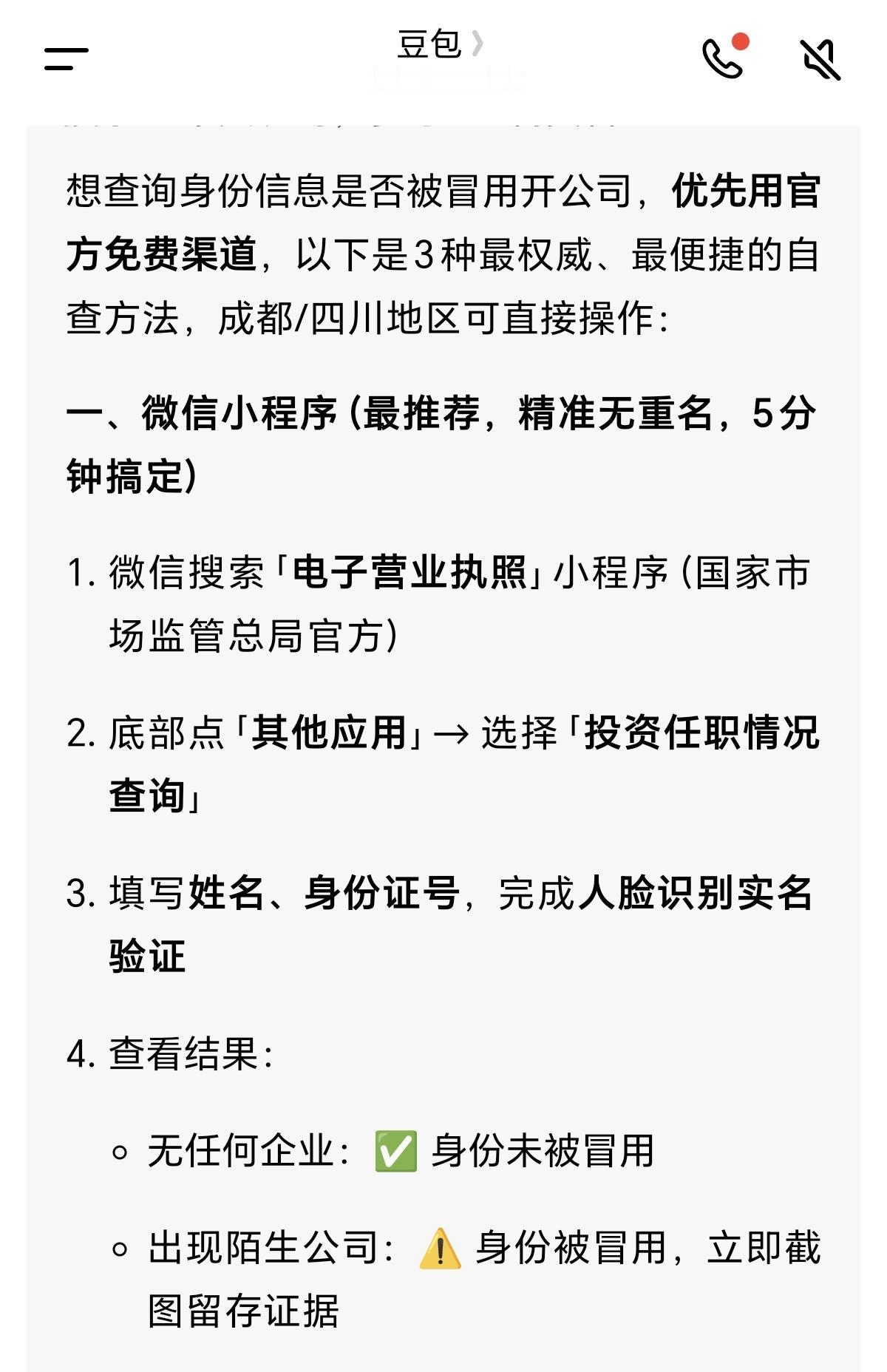 没想到已经是大数据的年代了 冒用别人的身份信息开公司居然这么容易。最不可思议的是相关部门居然是让信息被冒用的人自己自查。吓得我赶紧去问了豆包,怎么查询自己的信息有没有被盗用。