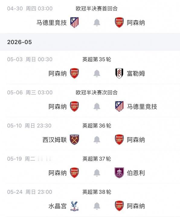 英超联赛的赛程安排真的让人一言难尽! 最后阶段两支争冠球队曼城和阿森纳都要经历一波七天三赛的密集赛程。 阿森纳会在4月30日到5月6日先后两次在欧冠联赛对阵马竞,中间还夹杂着一场对阵富勒姆的英超联赛。 曼城会在5月14日到5月20日在英超联赛中对阵水晶宫和伯恩茅斯,中间还夹杂着一场对阵切尔西的足总杯决赛。 阿森纳欧冠已经进入了半决赛,是万万不能放弃的,曼城足总杯已经进入了决赛,同样不会放弃,两队在都在两项赛事中进入了最后的冲刺阶段。 但是在赛季最关键的冲刺阶段,两队却迎来了最密集的赛程,现在就看曼城和阿森纳谁能咬牙坚持到最后了。