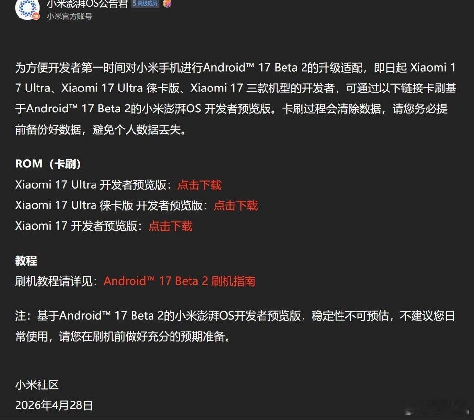 小米澎湃 OS 开发者预览版 Android 17 Beta 2 发布,适配 17、17 Ultra 等机型