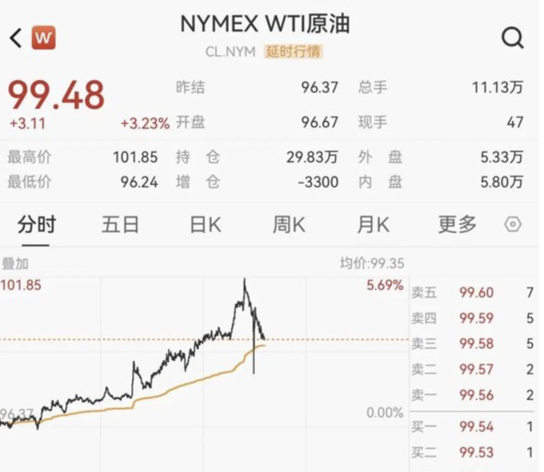 中东局势瞬息万变。刚才国际原油期货持续走高,WTI原油期货价格一度涨超5%,但随后快速跳水,最新报99.48美元/桶