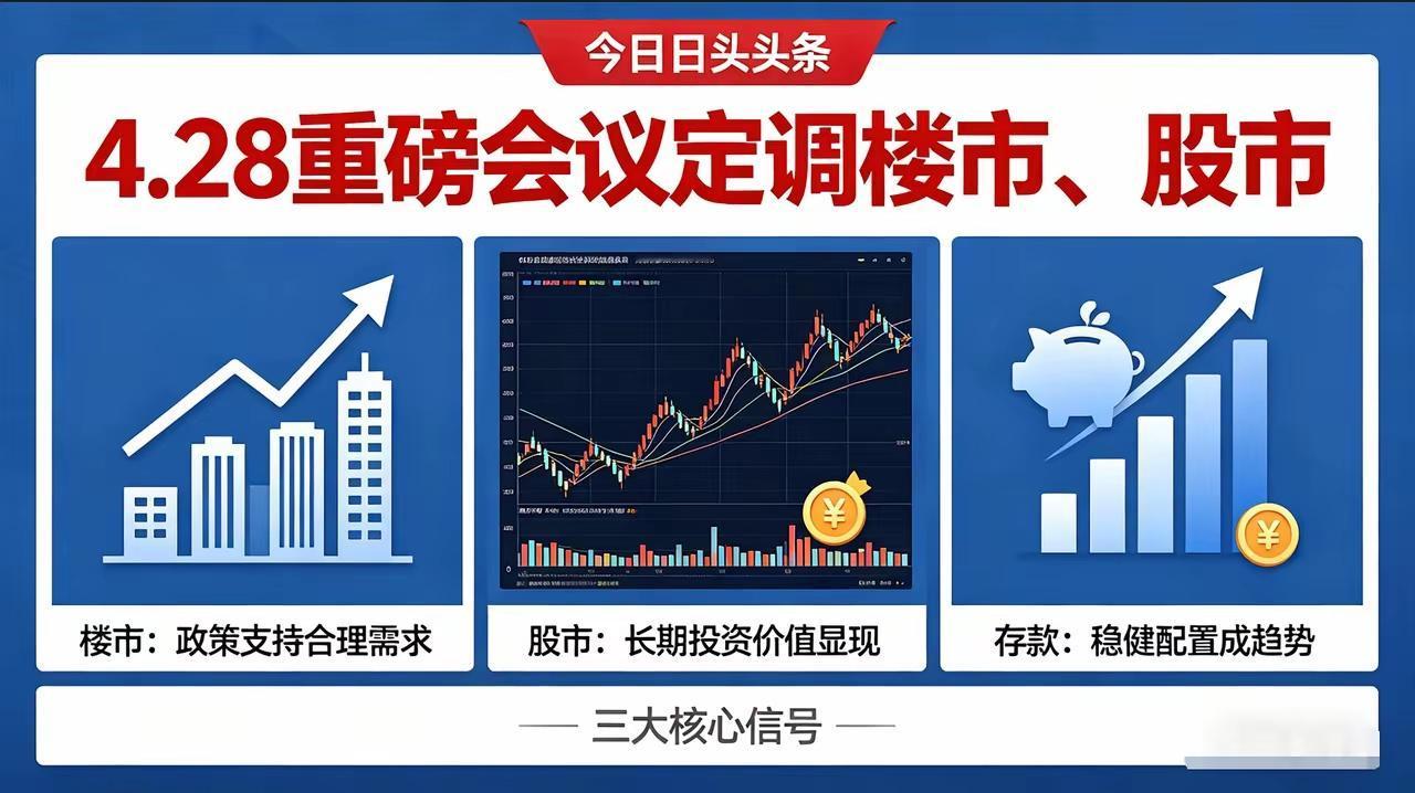 4.28重磅会议定调!你的房子、股票、存款,接下来要这么走 刚结束的高层会议,每句话都像定海神针,直接给今年的楼市、股市划了重点。手里有房的、炒股的、钱存银行的,这三个核心信号必须吃透,不然可能错过一整年的机会。 先看房地产,这次会议把它单独拎出来说,这是今年头一回。去年7月、12月两次同级别会议,楼市连个影子都没提,现在突然重点说“努力稳定房地产市场,扎实推进城市更新”,这里面的门道太深了。 说白了就三层意思:国家这次是真要稳住楼市了,后续政策只会多不会少;手里有房的别慌,稳房价是核心,大跌的可能性基本没了;接下来想在楼市里找机会,得盯紧“城市更新”——老小区改造、旧厂房翻新这些领域,不仅房子会升值,周边配套起来后,租金也能涨不少。 身边有个朋友在老城区有套老破小,之前担心跌价想赶紧卖,现在改主意了。他那片刚好在城市更新名单里,听说要加装电梯、拓宽马路,中介已经打电话说,改造完至少能多卖20万。这就是政策带来的实实在在的好处。 再说说被很多人忽略的“猪肉价格”。会议居然专门提了它,别觉得跟自己没关系,这直接关系到你存银行的钱会不会贬值。 猪肉是CPI的“晴雨表”,它的价格能直接拉动物价。现在银行一年期定存利率才0.95%,如果CPI能像会议暗示的那样涨到2%-3%,意味着把钱存银行,一年下来实际是亏的——10万块存一年,购买力可能少了2000多。 这时候大家肯定不想把钱躺银行里发霉,要么拿出来消费,要么去投资,市场上的钱一活,不管是楼市还是股市,都会跟着热起来。前阵子菜市场猪肉摊涨价,有人抱怨吃不起,现在才明白,这背后是国家在给经济“升温”,让钱流动起来,日子才能更活泛。 最后说股市,这次会议直接给了“抄作业”的机会,首次提出的“六张网”规划,就是未来资金要扎堆的地方。 这“六张网”分两类:新钱赛道和老钱赛道。新钱赛道是新型电网、算力网、新一代通信网,跟人工智能绑得死死的——家里的智能电表、小区的充电桩、手机信号塔升级,这些都是看得见摸得着的机会。就像最近算力板块涨得猛,其实早就藏在政策里了。 老钱赛道是水网、城市地下管网、物流网,叠加房地产的城市更新,这是稳增长的基本盘。楼下的排水管改造、社区里的蓄水池翻新,这些工程背后的企业,业绩肯定差不了。有个做管道建材的老板说,最近订单排到了三季度,全是市政工程的单子。 会议还特意提了“人工智能+”,这可不是喊口号。现在小区里的智能门禁、超市里的自助结账、工厂里的机器人流水线,全是“AI+”的落地场景。买股票盯着这些领域,比瞎买题材股靠谱多了——毕竟国家的钱往哪砸,机会就在哪。 再说说存款,要是CPI真涨到3%,存银行就不划算了。但也不能瞎折腾,稳妥点的可以看看跟“六张网”相关的基金,比如电力、通信主题的,风险不高,收益比存款强;胆子大点的,选几个业绩扎实的算力、电网股,拿着不动,大概率比存银行强。 有个阿姨前阵子把50万存款取出来,买了只电力设备股,理由很实在:“国家要建新型电网,肯定得买设备,这公司业绩差不了。”现在已经赚了8万,比存银行三年的利息还多。 这次会议说到底就一个核心:让钱活起来,让大家的日子好起来。楼市稳住了,不用担心资产缩水;物价慢慢涨,钱不再躺平;股市有了明确方向,不用瞎猜瞎撞。 普通人要做的,就是跟着政策走。房子在城市更新区的,别急着卖;手里有余钱的,别全存银行;炒股的,盯着“六张网”和“人工智能+”,准没错。 你最关心楼市还是股市?手里的钱打算怎么安排?