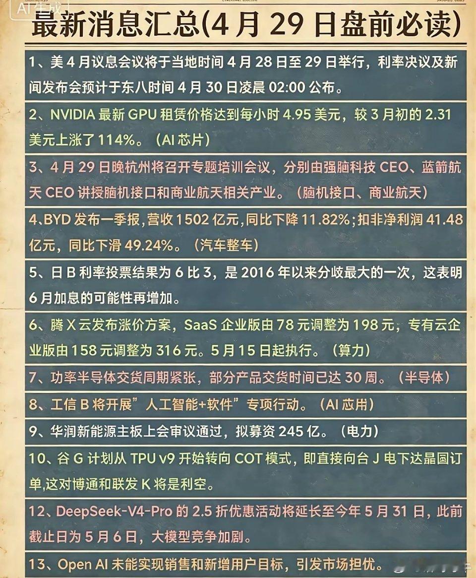 4月29日盘前必读消息汇总来了!美联储议息、英伟达GPU涨价、脑机接口与商业航天专题会议、比亚迪一季报、日本利率分歧加剧、腾讯云算力涨价、功率半导体交期紧张、工信部AI+软件专项行动、华润新能源上会、谷歌TPU模式调整、DeepSeek优惠延期、OpenAI目标不及预期,多维度梳理市场关键信息,把握节前交易脉络,投资路上不迷路。
