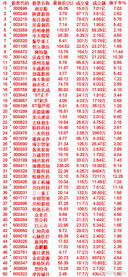 利安隆:最新价 45.05 元,成交量 15.8 万手,成交额 7.01 亿元陕建股份:最新价 3.70 元,成交量 97.1 万手,成交额 3.51 亿元拓日新能:最新价 5.71 元,成交量 79.8 万手,成交额 4.56 亿元汉森制药:最新价 7.14 元,成交量 27.0 万手,成交额 1.90 亿元药明康德:最新价 110.57 元,成交量 53.8 万手,成交额 59.25 亿元中天精装:最新价 26.30 元,成交量 8.39 万手,成交额 2.15 亿元