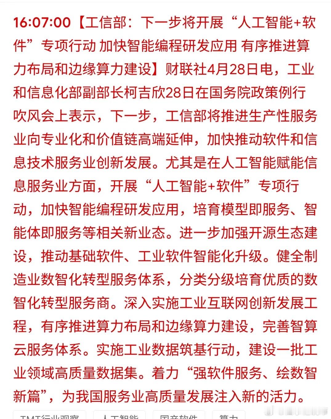一、三大产业链集体涨价 算力上游供需持续偏紧消息性质:行业高景气+涨价双重利好国际Intel、AMD服务器CPU自2月起涨价10-15%,Q3计划再度提价;氦气、氙气等工业气体价格暴涨,高纯氦气单月涨幅近十倍;高端GPU算力租赁价格持续走高,头部厂商订单与营收双爆发。上游涨价直接印证算力需求爆发,国产替代赛道迎来量价齐升机遇。利好板块:服务器CPU、算力租赁、工业气体、半导体材料核心受益股:海光信息、龙芯中科、润泽科技、优刻得、华特气体、金宏气体二、科创板数字芯片设计专场业绩说明会明日召开消息性质:科技自立自强政策催化利好4月29日科创板举办数字芯片设计专场业绩说明会,乐鑫科技、海光信息、安路科技等多家核心企业参会,围绕十五五科技自立自强主题,解读行业发展机遇与投资价值。科创芯片企业集中亮相,进一步强化国产芯片赛道的市场关注度与资金吸引力。利好板块:数字芯片设计、科创板半导体、国产芯片核心受益股:海光信息、乐鑫科技、安路科技、源杰科技、恒玄科技三、工信部启动“人工智能+软件”专项行动 算力建设全面提速消息性质:国家级AI产业重磅政策利好工信部将开展人工智能+软件专项行动,推进智能编程研发应用,培育MaaS、智能体即服务新业态,升级基础软件与工业软件,同时加快算力、边缘算力布局,完善智算云服务体系。政策全方位覆盖AI软件与算力基建,产业发展迎来顶层支撑。利好板块:AI软件、智能编程、工业软件、边缘计算、算力基建核心受益股:科大讯飞、中科创达、中国软件、宝信软件、光环新网四、发改委推进城市停车设施建设 民生基建再添新风口消息性质:城市基建+智慧民生政策利好十五五期间将加快城市停车设施建设,重点盘活老旧小区闲置资源,新建改造停车设施,破解停车难问题。停车设施建设需求集中释放,智慧停车产业链迎来增量市场,相关设备与运营企业直接受益。利好板块:智慧停车、停车设备、智慧城市核心受益股:捷顺科技、五洋停车、东杰智能、安居宝五、16条举措稳就业 助力经济与消费平稳运行消息性质:宏观稳增长+民生保障利好人社部出台16条举措支持高校毕业生就业,通过税费减免、见习岗位开发、稳岗返还等政策,鼓励企业吸纳毕业生,同时开展实名帮扶与就业实训。稳就业政策落地将稳定居民收入预期,带动消费复苏,同时利好人力资源服务赛道。利好板块:人力资源服务、职业教育、大消费核心受益股:科锐国际、中公教育、传智教育整体盘面解读今日盘后五条消息均为实质性利好,形成科技成长领涨、涨价逻辑加持、政策全面护航、基建消费托底的市场格局。核心主线聚焦算力芯片、AI软件、工业气体三大高景气方向,科创芯片专场叠加政策催化,节后科技赛道有望迎来资金集中布局。智慧停车、稳就业相关板块则具备低位补涨潜力,市场整体情绪持续向好。