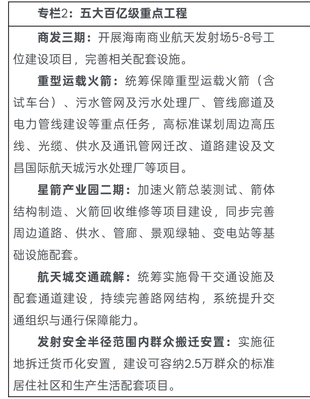 🏗️ 五大百亿级重点工程全面开工✅ 商发三期:海南商业航天发射场5-8号工位建设,完善配套设施,为高频次商业发射筑牢基础✅ 重型运载火箭:统筹保障火箭及试车台建设,同步推进污水管网、电力管线、道路迁改等配套工程✅ 星箭产业园二期:加速火箭总装测试、箭体制造、回收维修等项目,完善道路、变电站等基础设施✅ 航天城交通疏解:升级骨干交通设施,优化路网结构,提升航天任务通行保障能力✅ 群众搬迁安置:建设可容纳2.5万人的标准化社区,完善生产生活配套,保障发射安全
