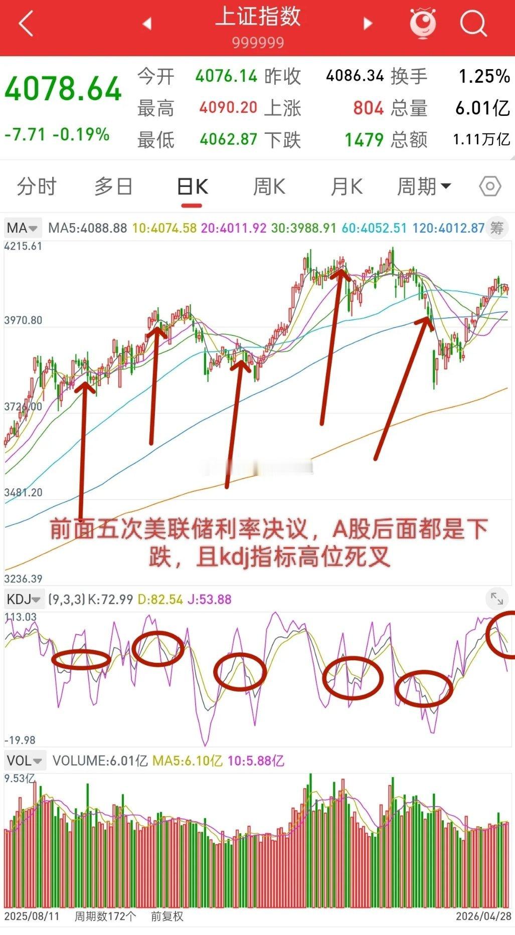 4.30号美联储利率决议,也就是后天,回顾前面五次,9.18,10.30,12.11,1.29,3.19,这些日子都是美联储利率决议的时间,不管降息(当天冲高回落),还是维持不变,大盘后面都是下跌的,而且神奇的是,这些日子kdj指标都是高位死叉。
