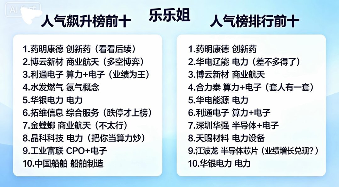 1.药明康德 创新药2.华电辽能 电力(差不多得了)3.博云新材 商业航天4.合 力 泰 算力+电子(套人有一套)5.华电能源 电力6.利通电子 算力+电子7.深圳华强 半导体+电子8.天赐材料 电力设备9.江 波 龙 半导体芯片(业绩增长兑现?)10.华银电力 电力