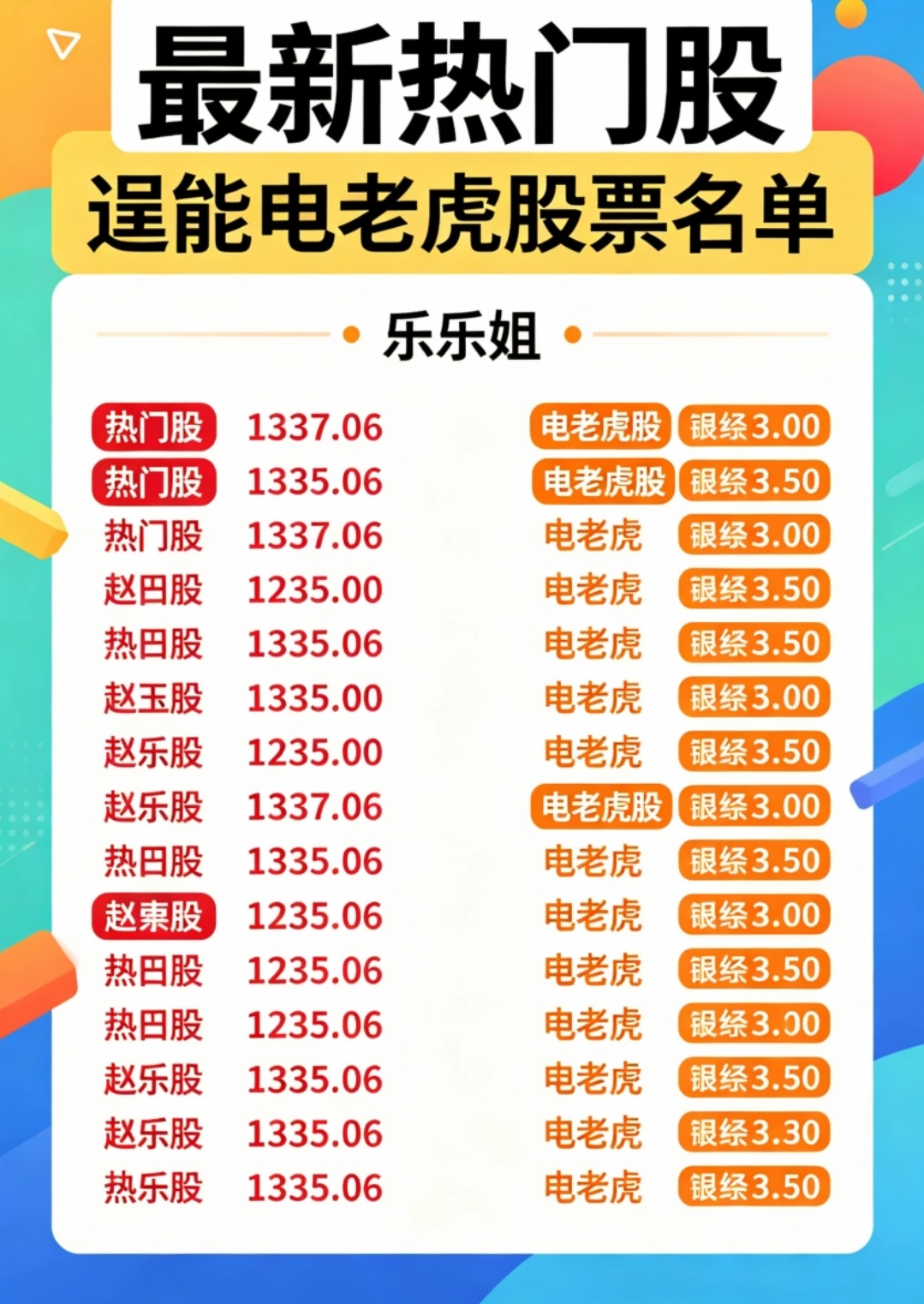 最新热门股、逞能电老虎:1、华电辽能;2、华电能源;3、药明康德;4、博云新材;5、合力泰;6、利通电子;7、华银电力;8、深圳华强;9、金螳螂;10、天赐材料;11、水发燃气;12、江波龙;13、拓维信息;14、神剑股份;15、晶科科技;16、维科技术;17、工业富联;18、华胜天成;19、铜冠铜箔;20、圣阳股份;21、拓日新能;22、莲花控股;23、东方财富;24、综艺股份;25、三维通信;26、德隆惠能;27、立讯精密;28、巨力索具;29、节能风电;30、赤天化;31、铭普光磁;32、永鼎股份;33、多氟多;34、蜀道装备;35、江特电机;36、亨通光电;37、顺灏股份;38、粤电力A;39、再升科技;40、美诺华;41、永杉锂业;42、中际旭创;43、苏州高新;44、安诺其;45、中天科技;46、华特气体;47、利欧股份;48、天通股份;49、飞马国际;50、东山精密;51、金安国纪;52、众和科技;53、中嘉博创;54、航天发展;55、中信证券;56、津药药业;57、光迅科技;58、宁波建工;59、平潭发展;60、新易盛;61、东方智造;62、蓝色光标;63、凯莱英;64、三安光电;65、协鑫能科;66、中晶科技;67、阳光电源;68、紫金矿业;69、特变电工;70、盈峰环境;71、洲际油气;72、宏景科技;73、中利集团;74、天齐锂业;75、日海智能;76、协创数据;77、贵州茅台;78、金风科技;79、华工科技;80、群兴玩具;81、西部材料;82、雄韬股份;83、国际复材;84、珈伟新能;85、剑桥科技;86、广发证券;87、云南锗业;88、好上好;89、信维通信;90、美利云;91、通富微电;92、凯美特气;93、烽火通信;94、湖南裕能;95、西藏珠峰;96、贝仕达克;97、王府井;98、森萱医药;